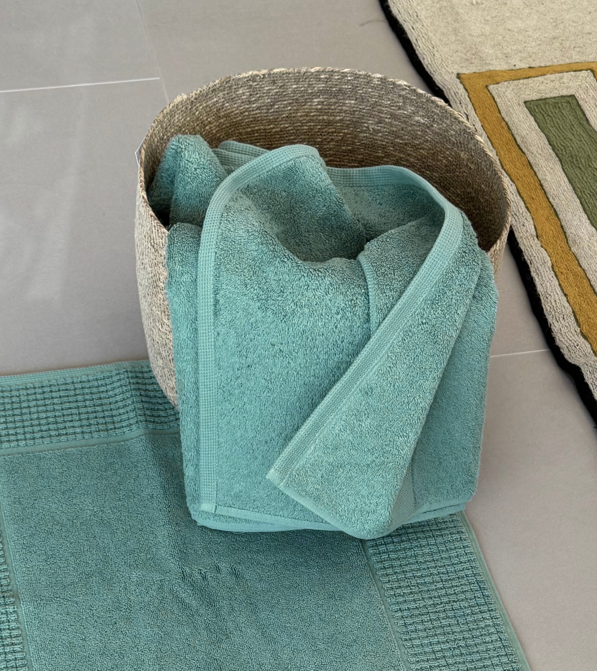 Gli asciugamani sono in tinta unita e arricchiti da un sobrio e moderno bordo in tinta unita.