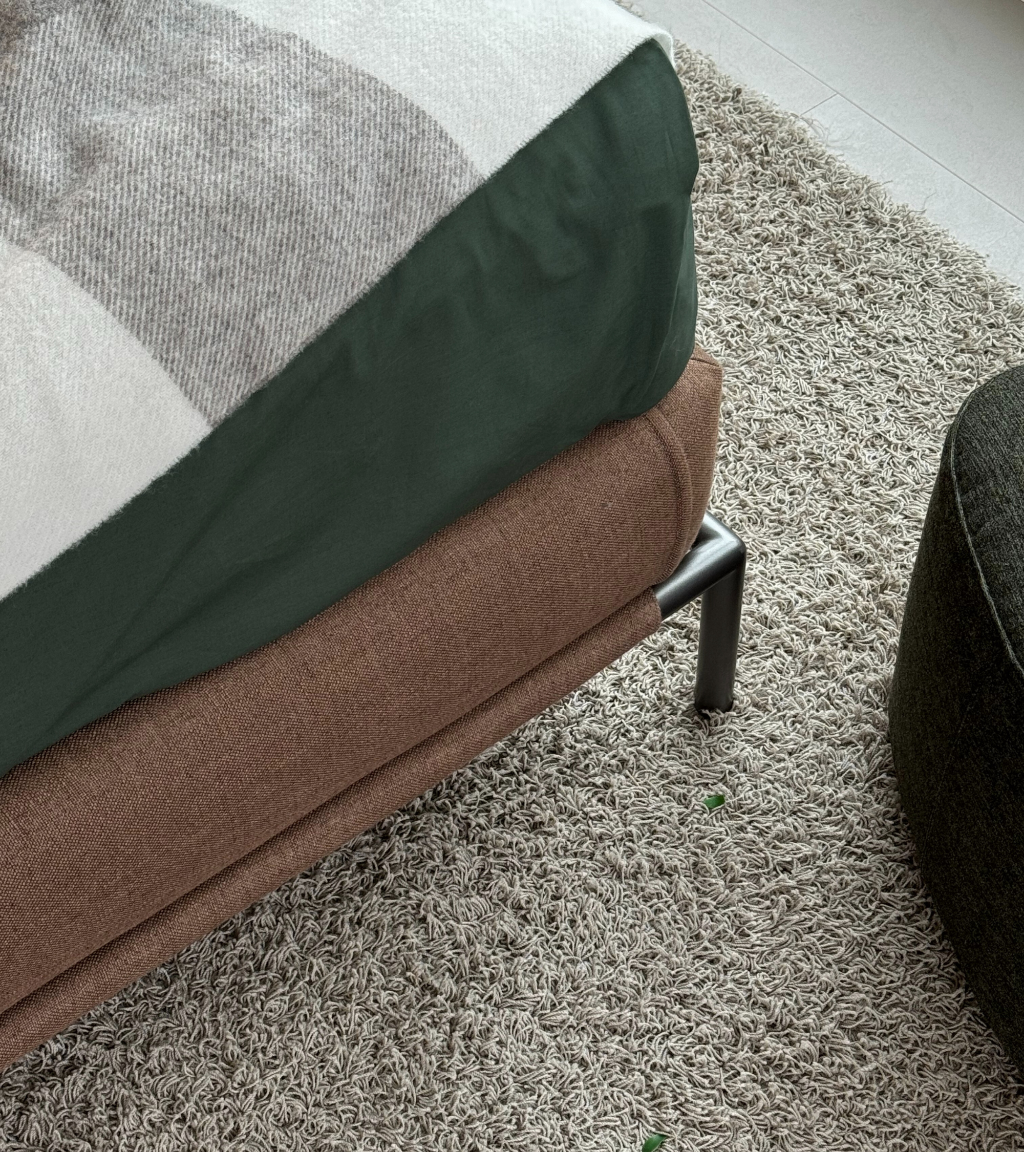 Design forte e deciso per un letto matrimoniale il cui carattere maschile, lontano dalle linee fredde e minimaliste, è ingentilito dall’importante componente tessile.