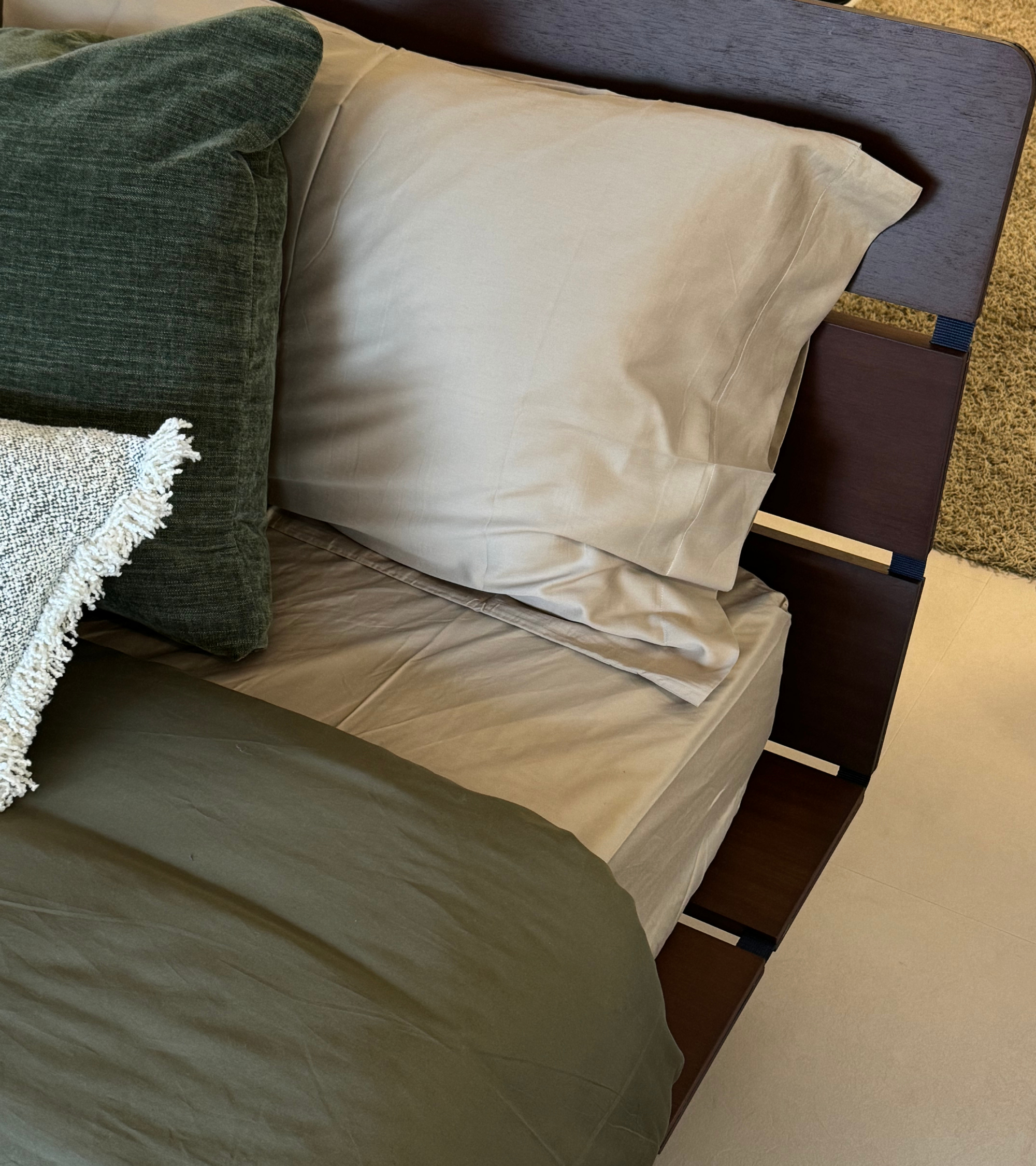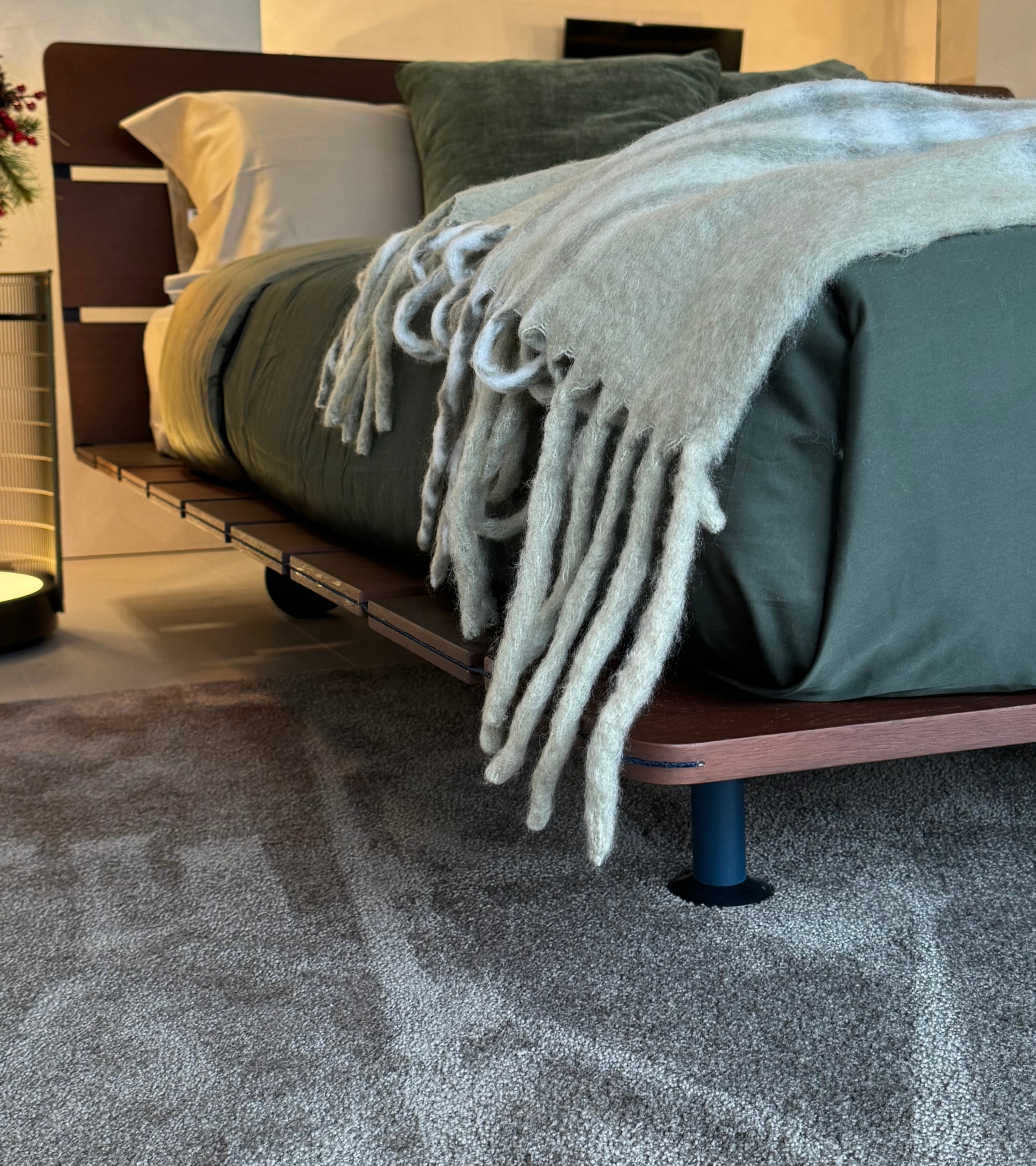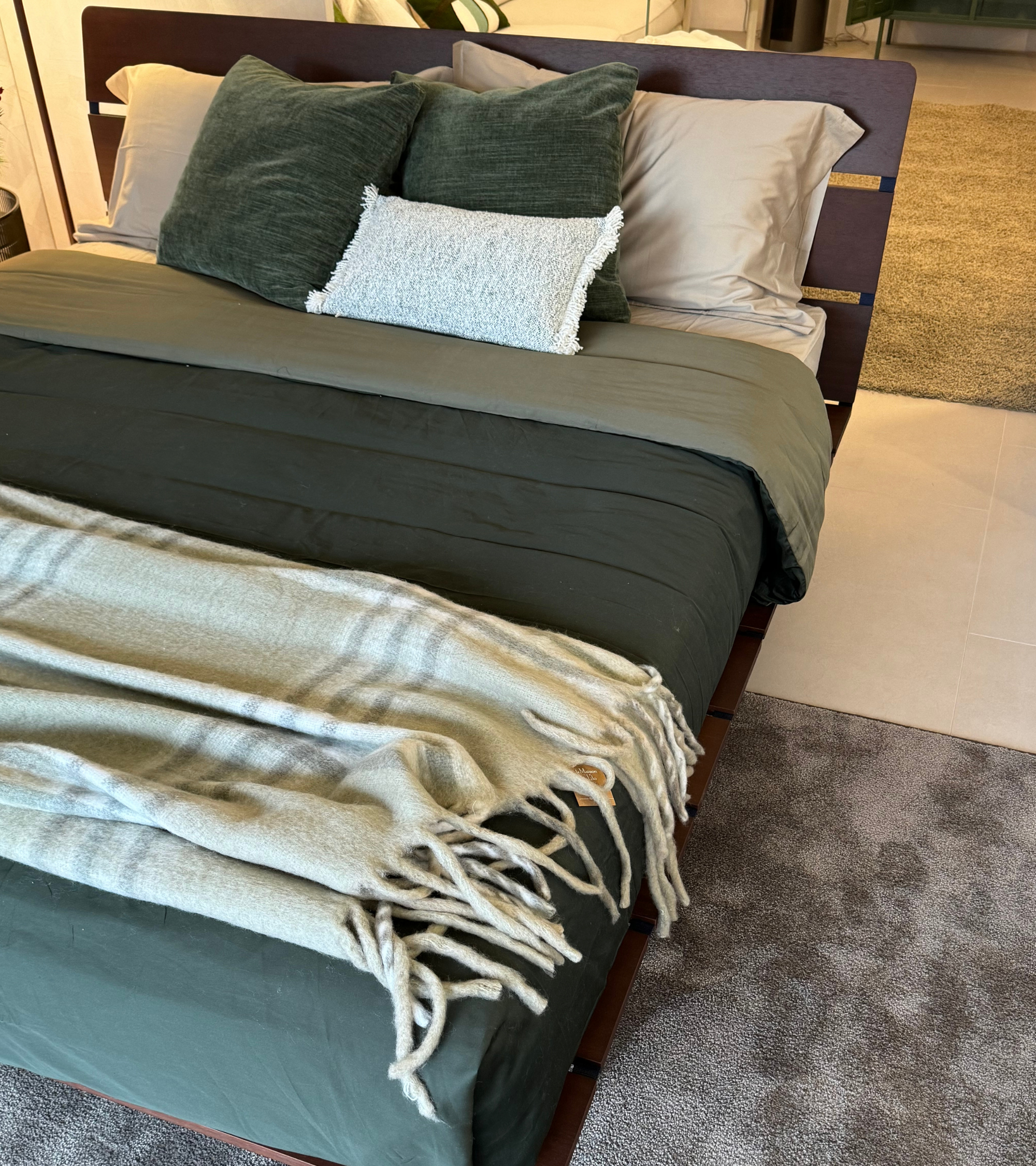 Letto d’ispirazione orientale, raffinato ed essenziale. La base d’appoggio del materasso è costituita da doghe portanti, che salgono senza interruzione a formare la testata.