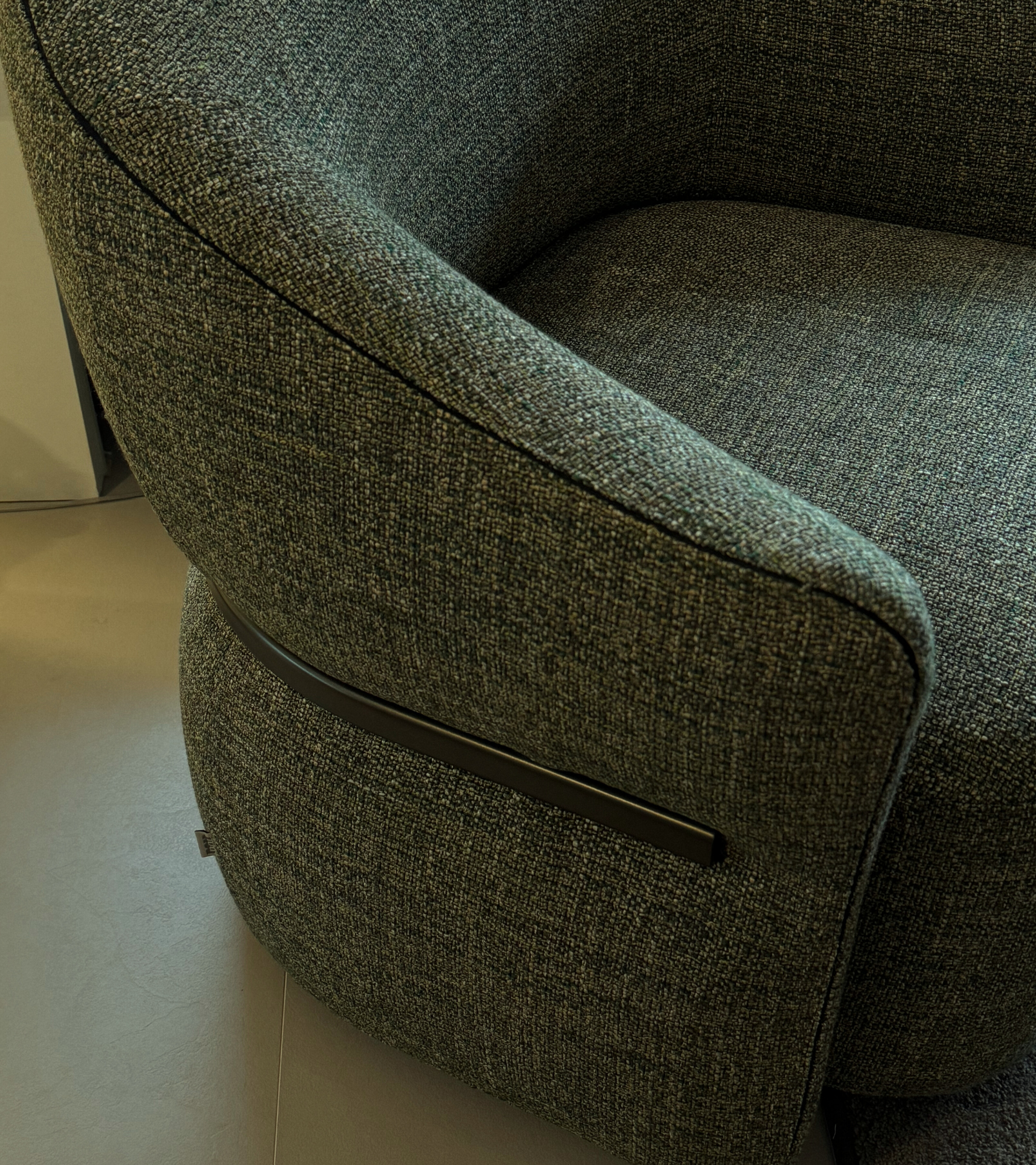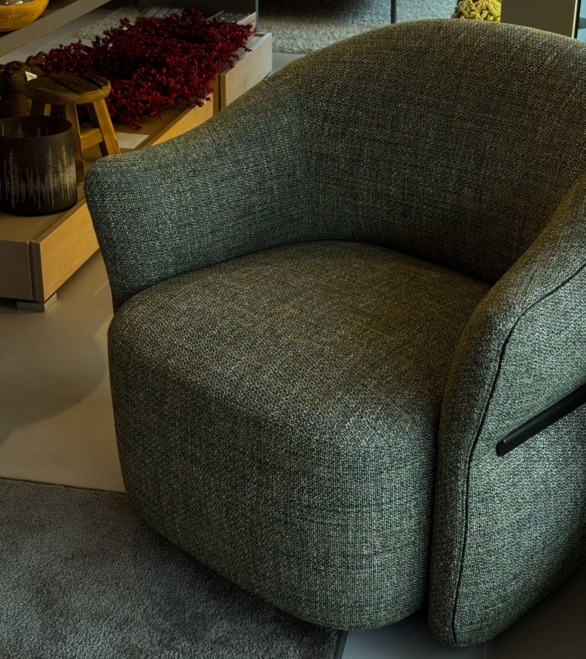 Poltrona dalla forma arrotondata, delicata e avvolgente che senza soluzione di continuità include seduta, braccioli e schienale, accoglie il corpo per farci sentire al sicuro.