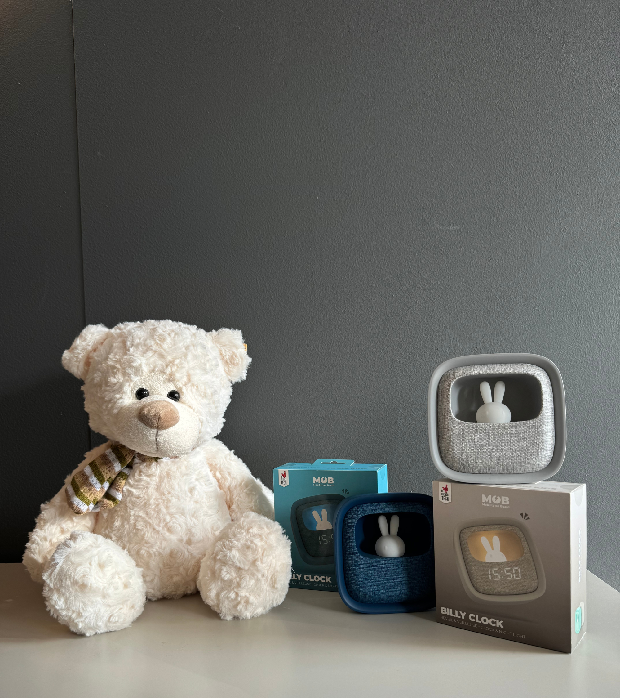 È possibile programmare l'ora, la data e due allarmi. La sveglia Billy veglierà sui tuoi bimbi grazie alla sua luce notturna integrata nel morbido coniglietto in silicone.
