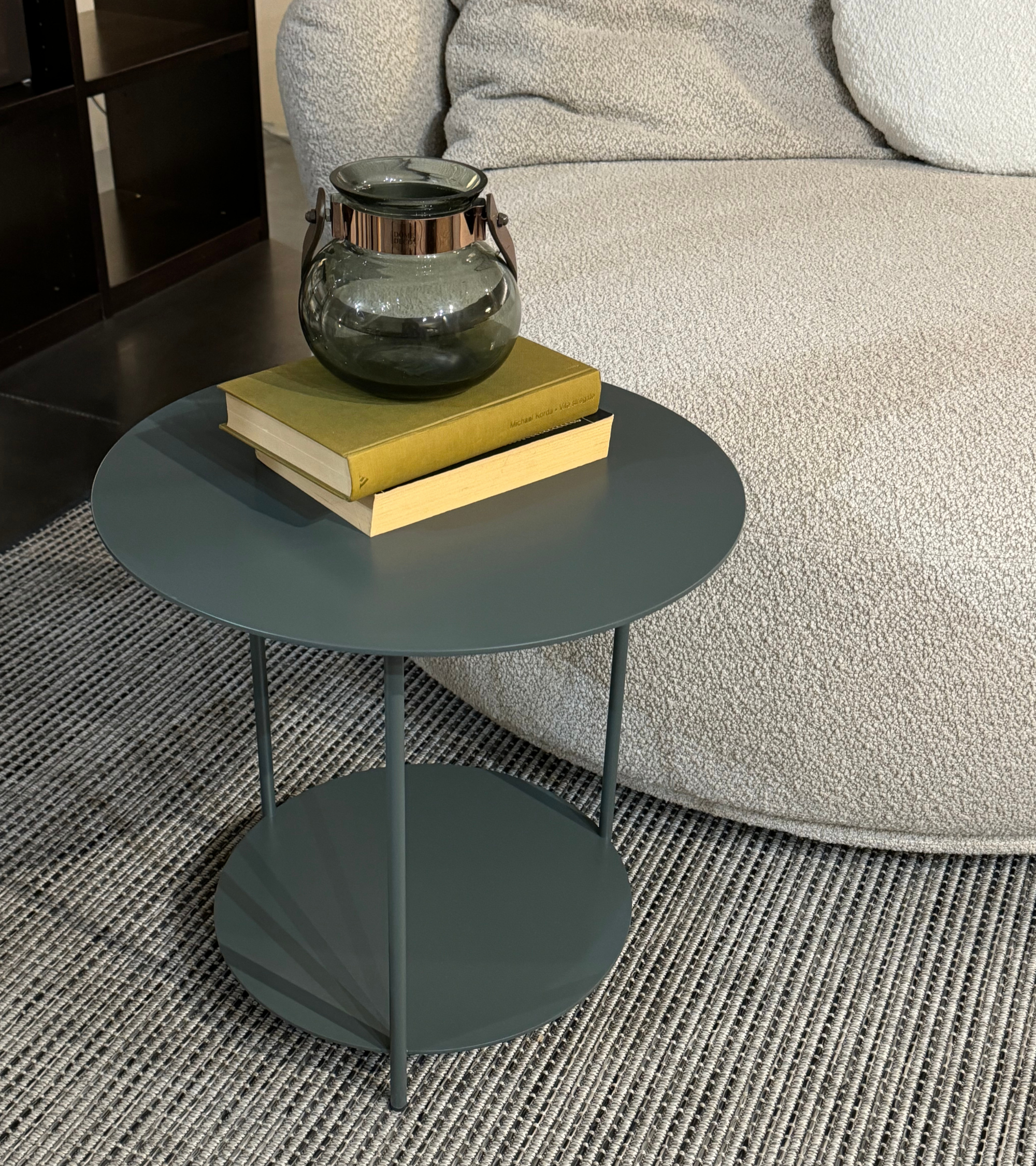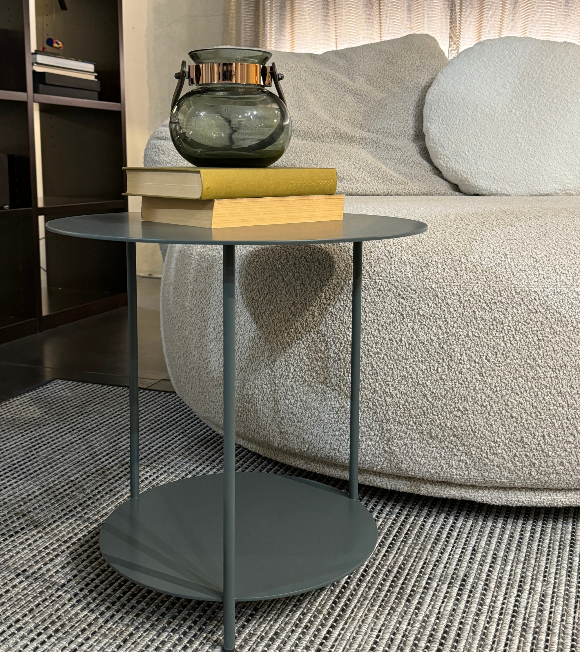 Ha una struttura in metallo con doppio piano circolare: quello superiore funge da superficie d’appoggio, mentre quello inferiore offre uno spazio aggiuntivo per riviste o oggetti. Le linee sono semplici e sottili, con un design leggero ma stabile. La finitura opaca e i colori contemporanei lo rendono elegante e facilmente abbinabile a diversi stili di soggiorno.