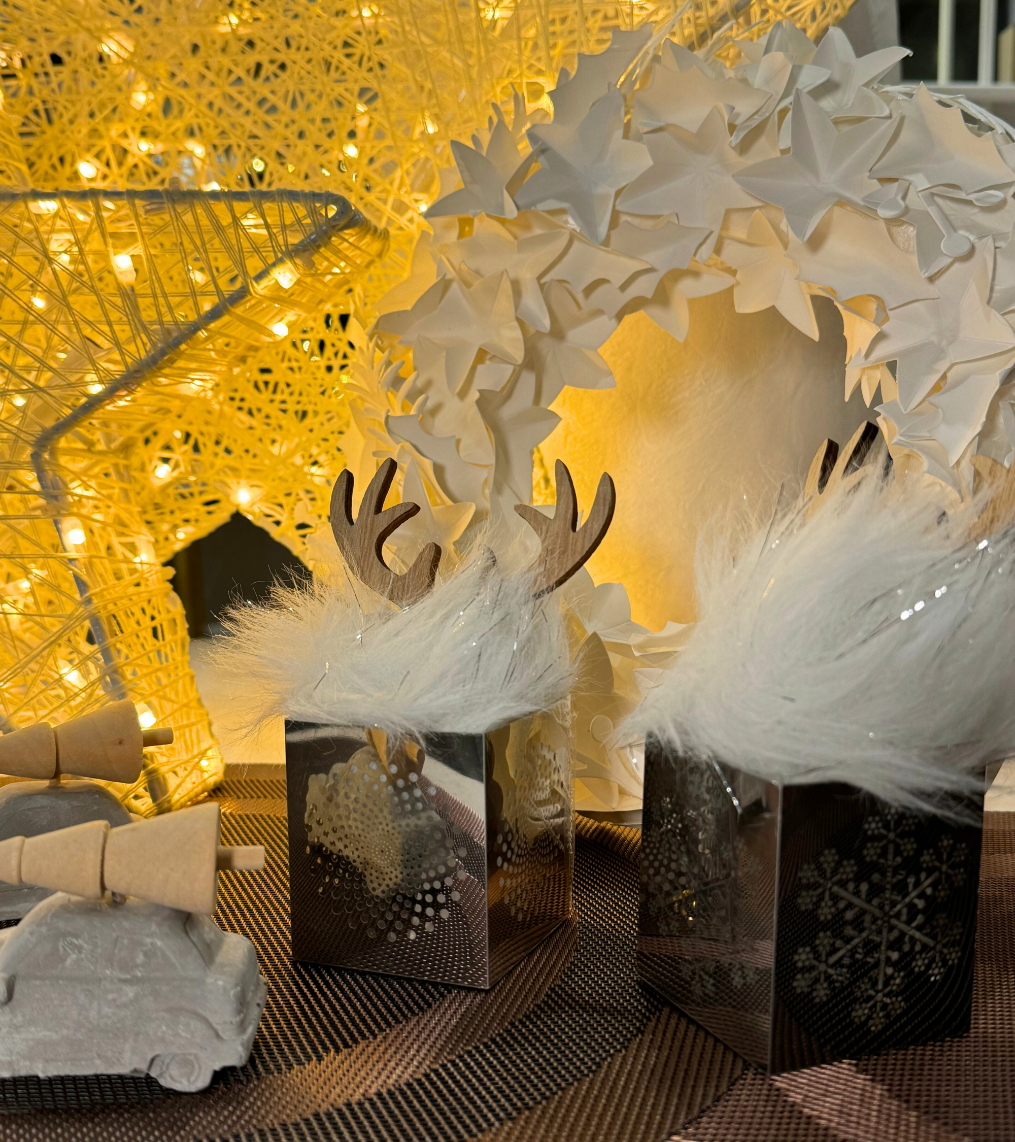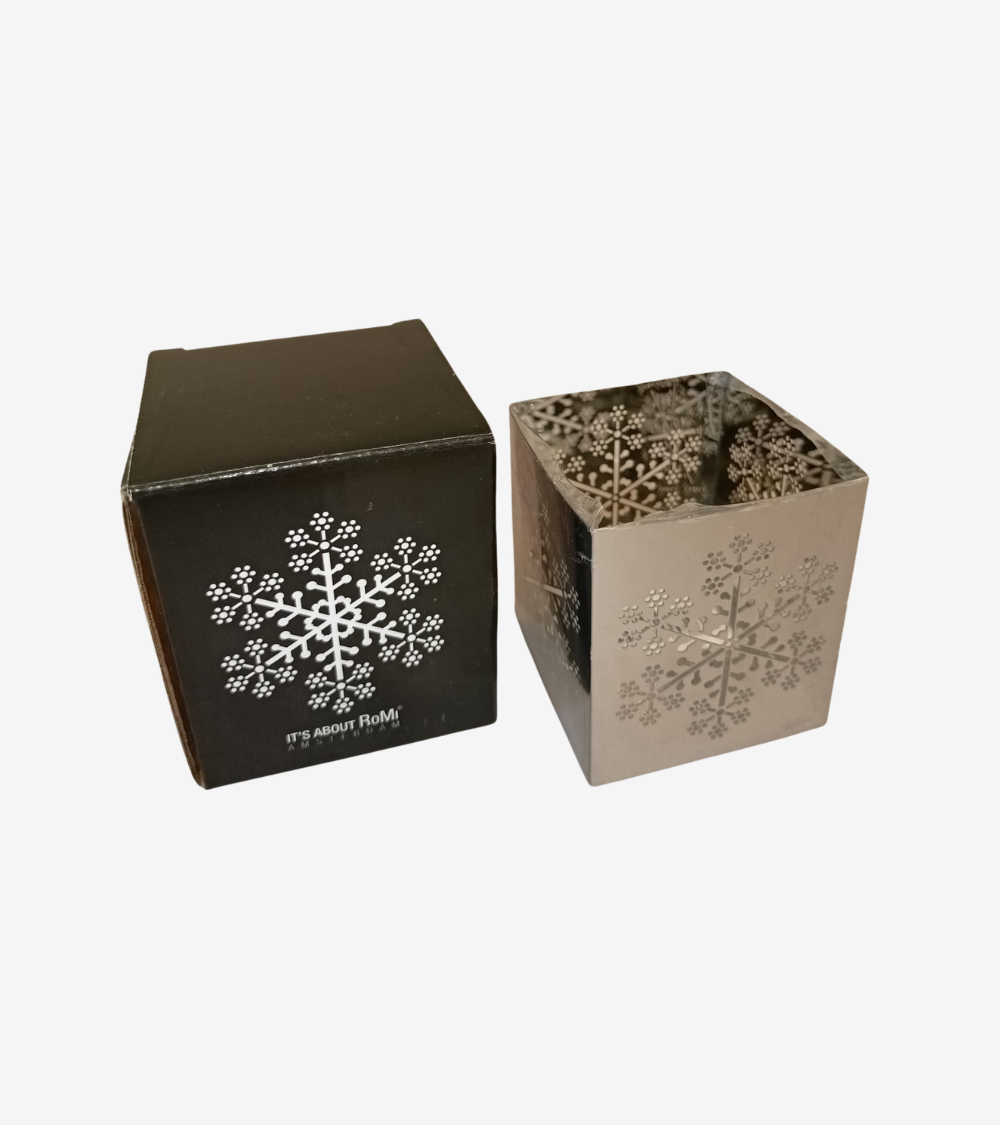 Votivo portacandela realizzato in metallo lucido con decorazione traforata a forma di fiocco di neve.