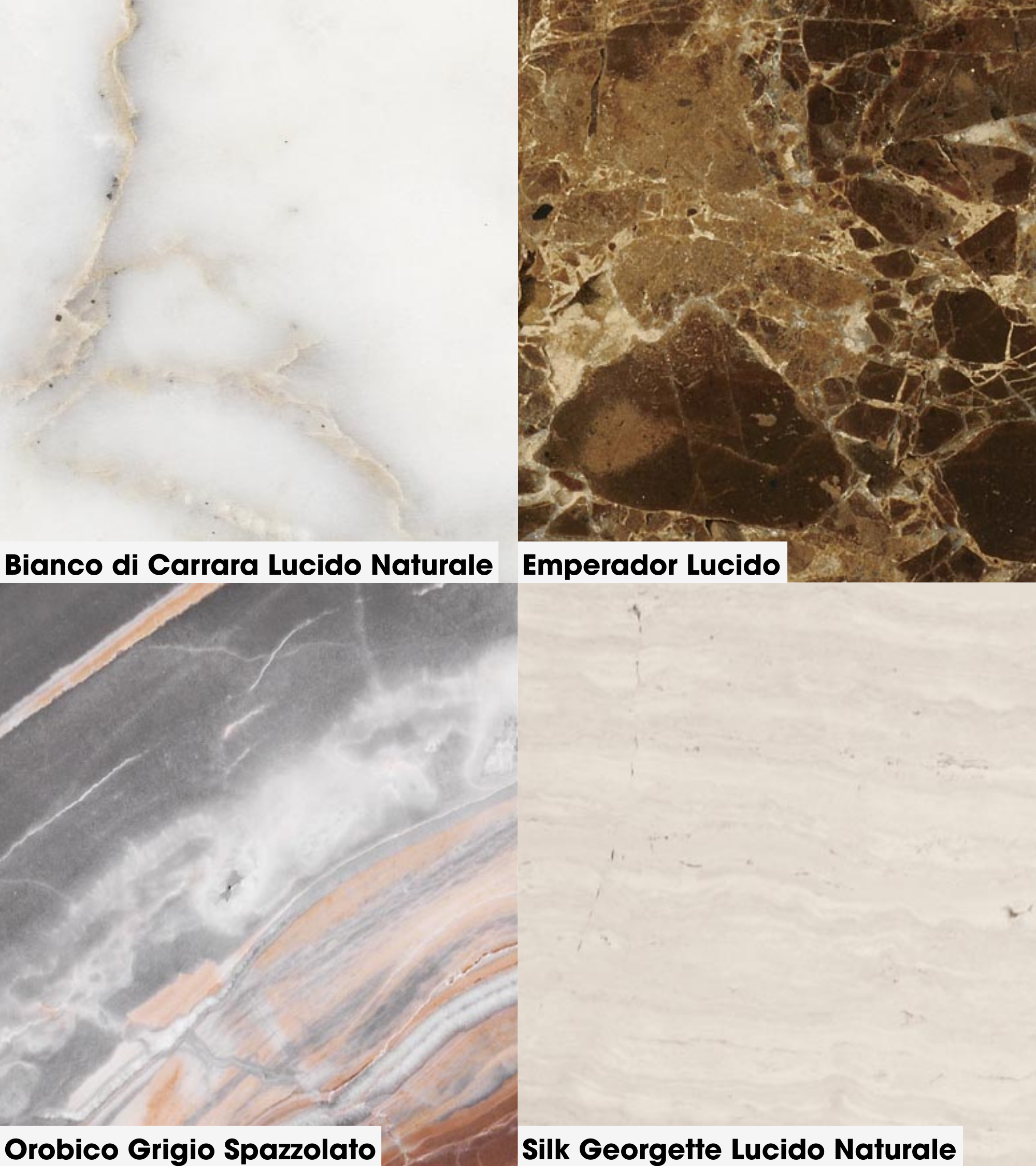 Chiaro di Luna, nella versione con base in marmo è elegante e pratico: offre due comodi piani di appoggio, quello superiore in vetro bronzato o trasparente e quello inferiore disponibile in diverse tipologie di marmo.
