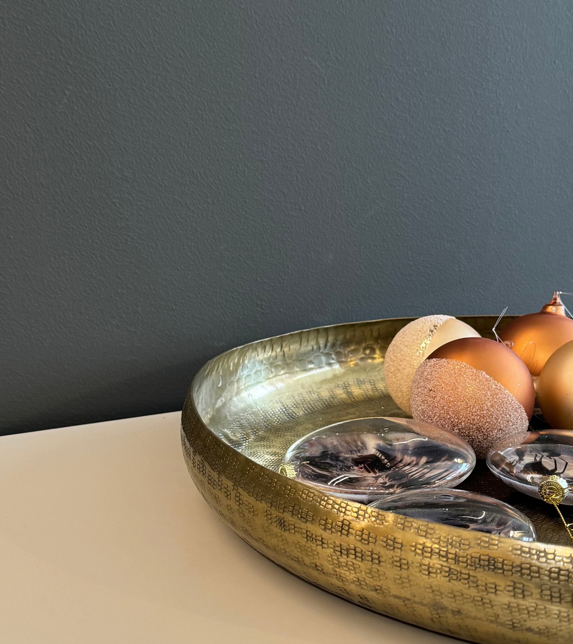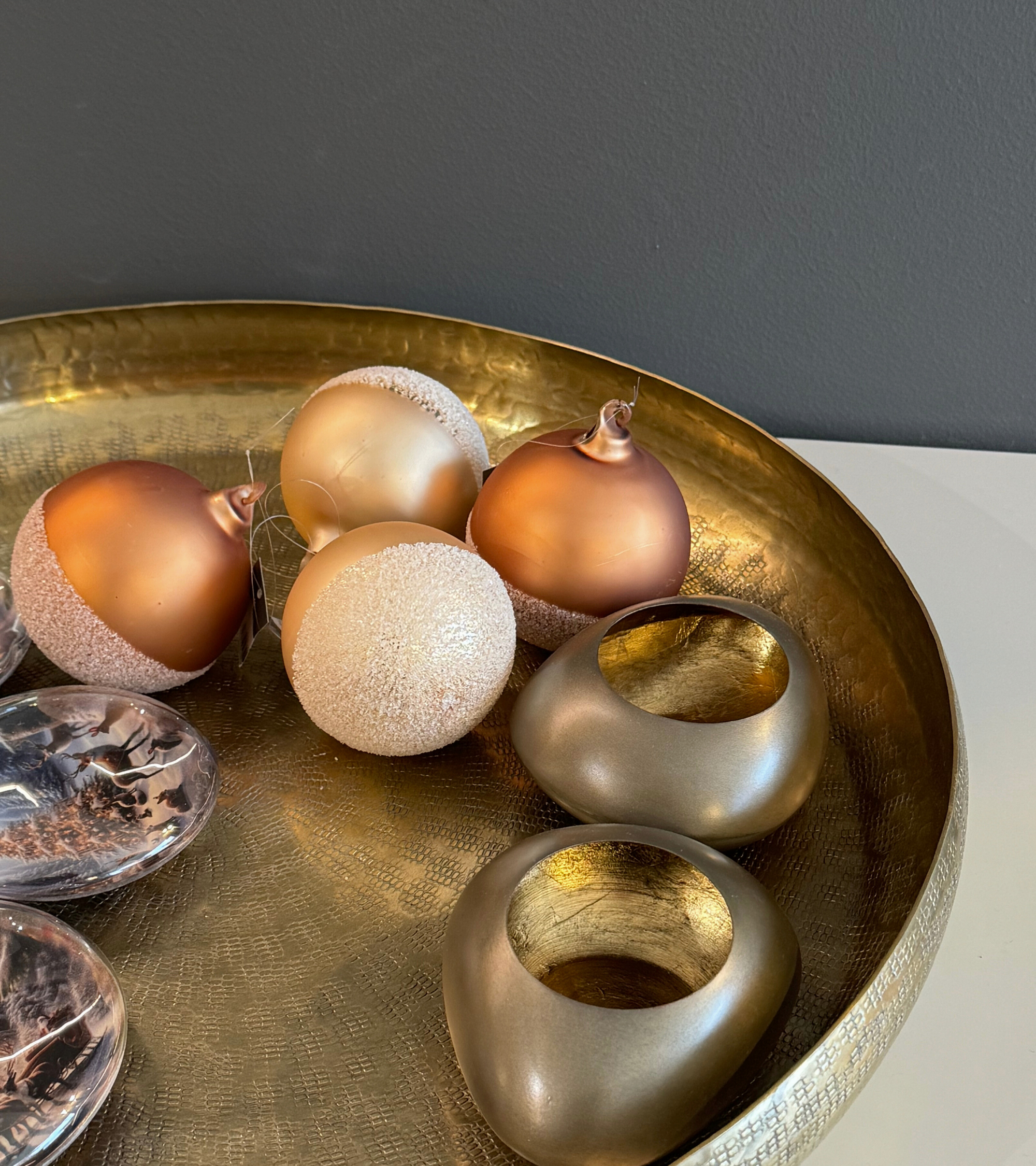Raffinata e luminosa, questa ciotola in finitura oro antico dona un tocco di eleganza senza tempo a qualsiasi ambiente. Perfetta come centrotavola o portacandela, combina artigianalità e fascino vintage per valorizzare ogni spazio con stile e calore.