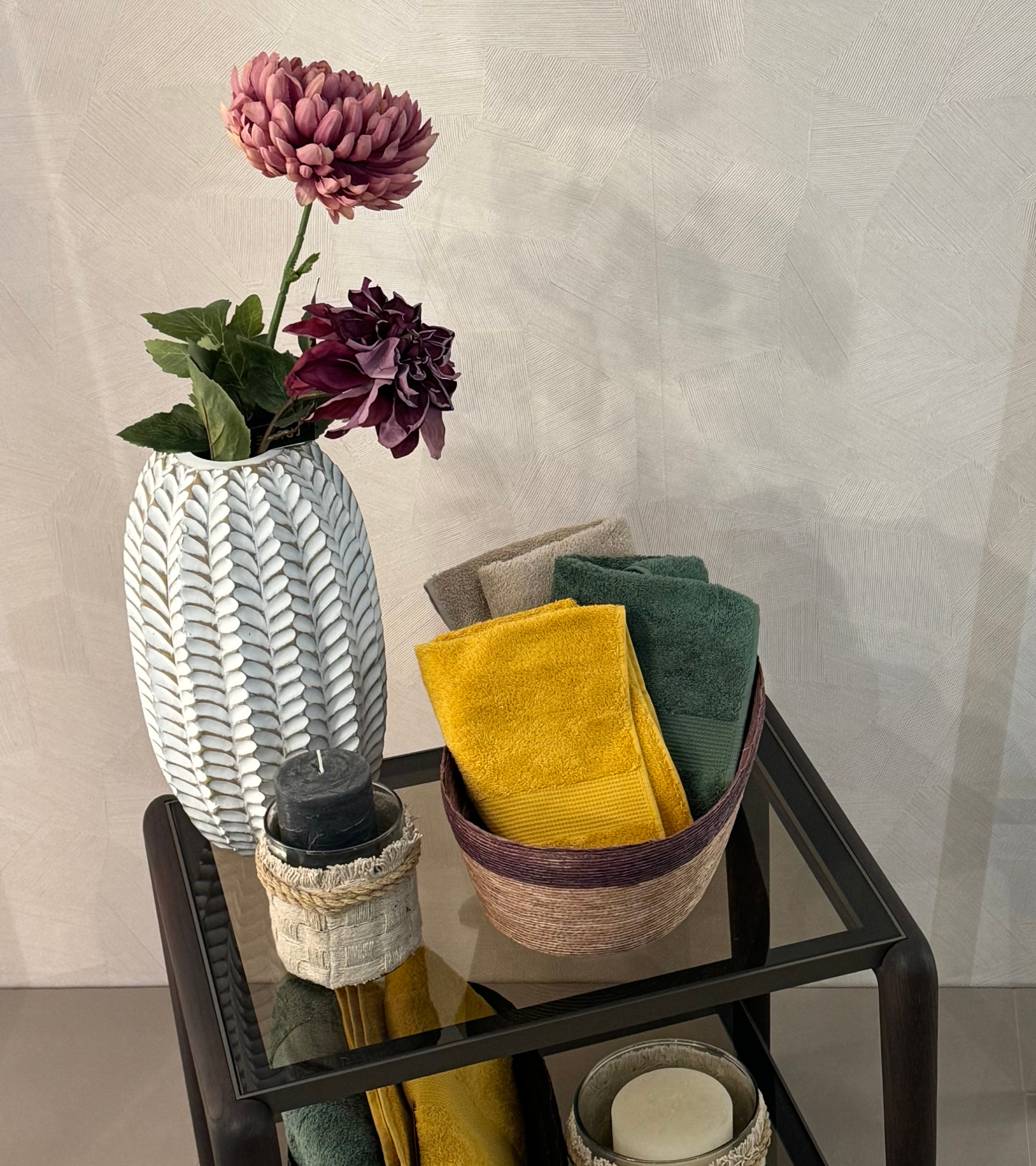 Gli asciugamani sono in tinta unita e arricchiti da un sobrio e moderno bordo in tinta unita.