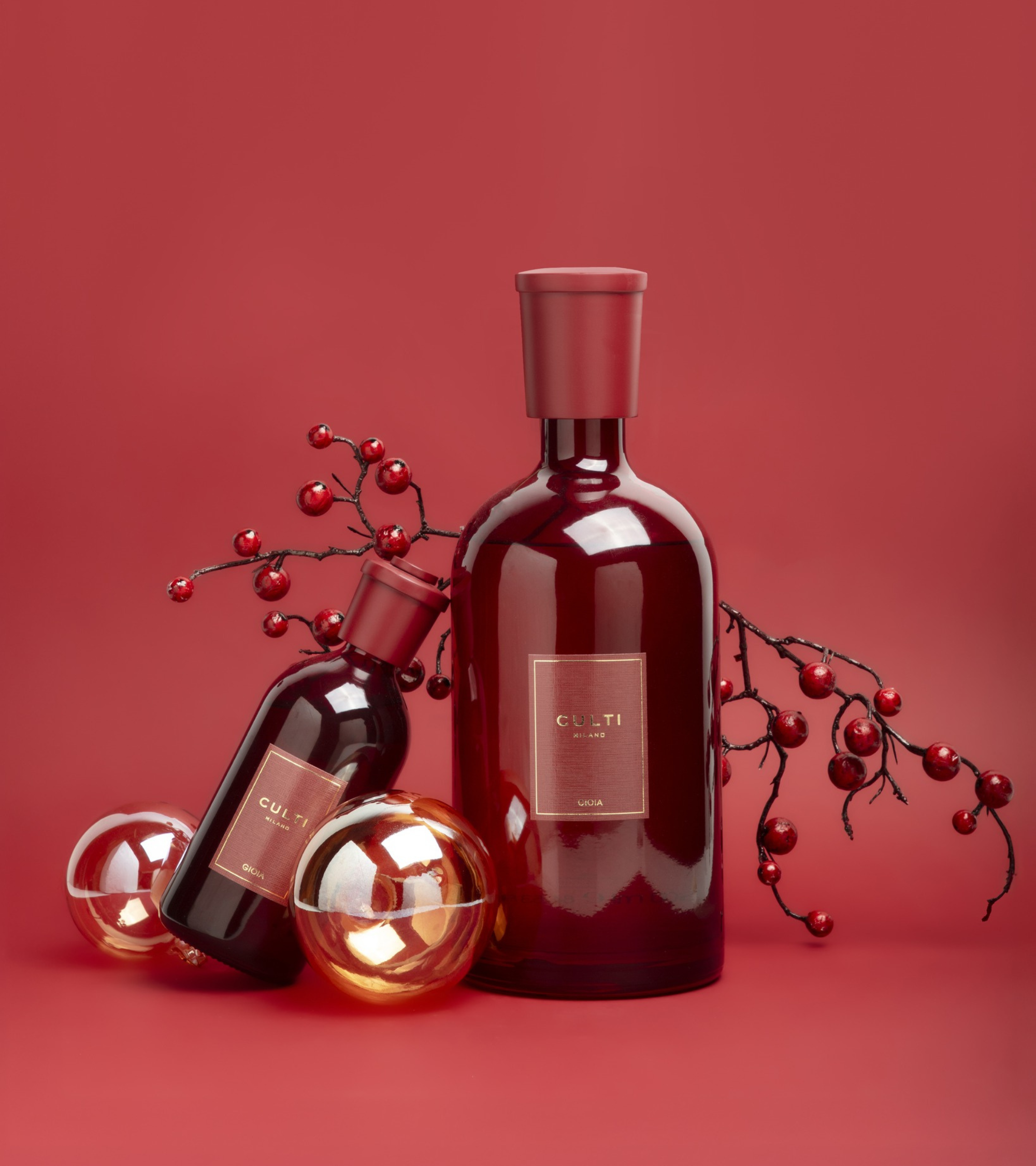 La bottiglia contiene 500 ml di essenza Gioia e ha le dimensioni di cm. di cm. 8 diametro x 21/35 altezza con bacchette.