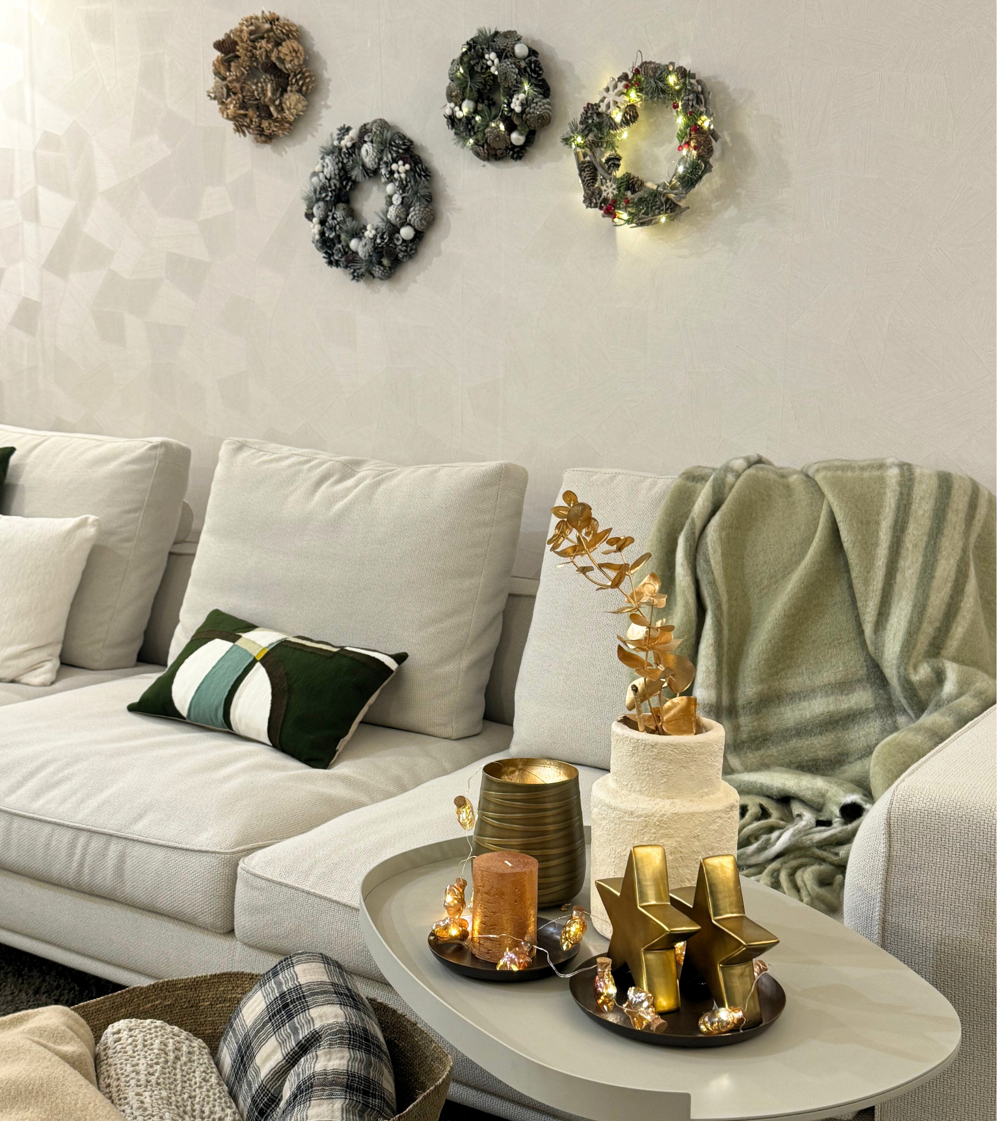Ghirlanda composta da legnetti, decorata con pigne, bacche, pino e fiocchi di neve.