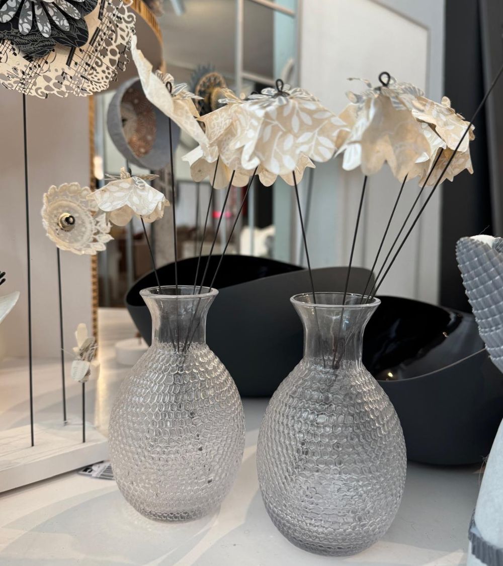 Elegante vasetto monofiore in vetro trasparente, con collo liscio e corpo con una texture in rilievo.
