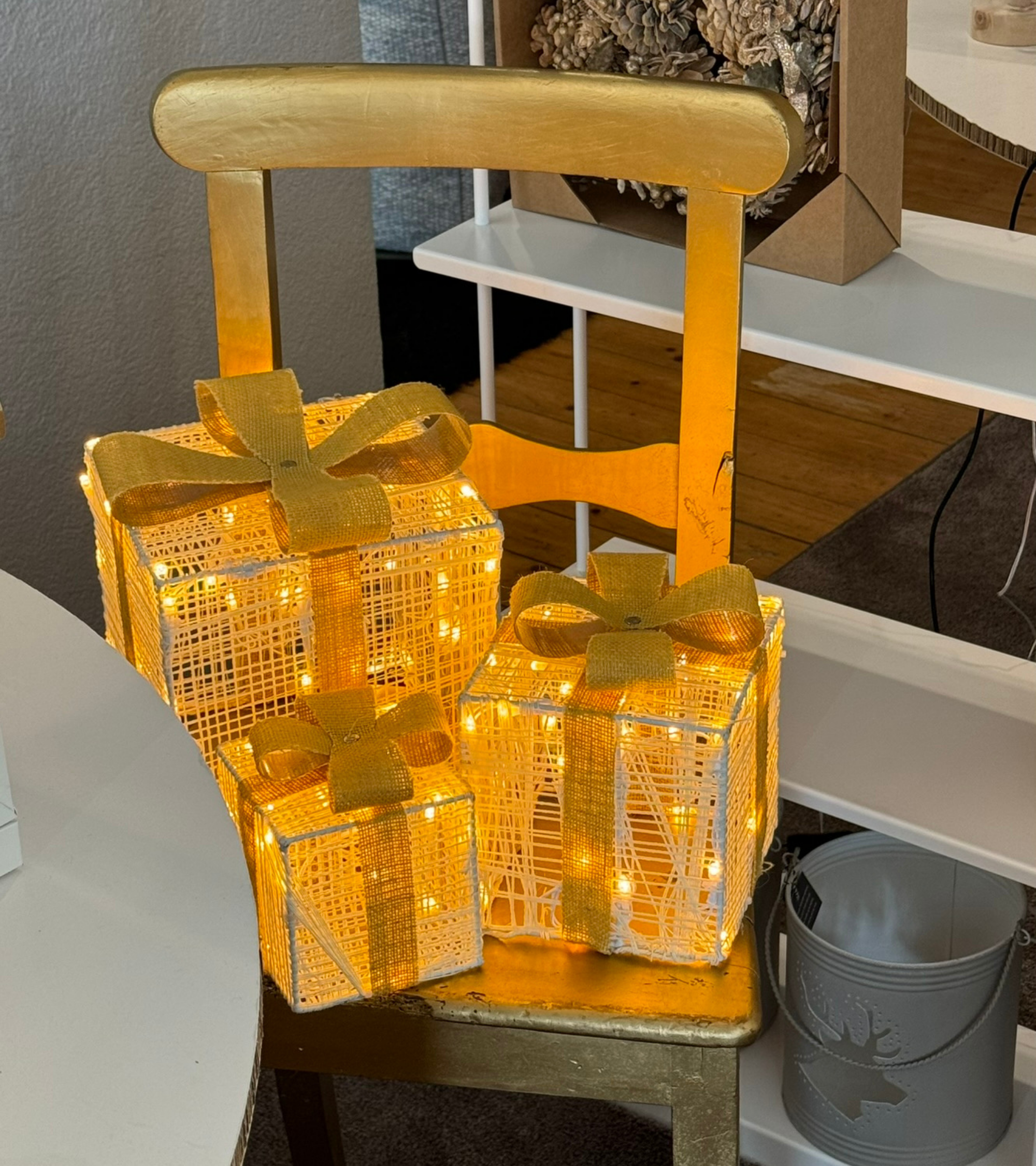 Illumina le feste con eleganza! Questo set di 3 pacchi regalo 3D con fiocco dorato e luci LED calde è perfetto per decorare l’albero, una parete o il tavolo di Natale. Raffinati e luminosi, creano un’atmosfera magica e festosa, ideale per dare un tocco di classe alle tue decorazioni di Natale.