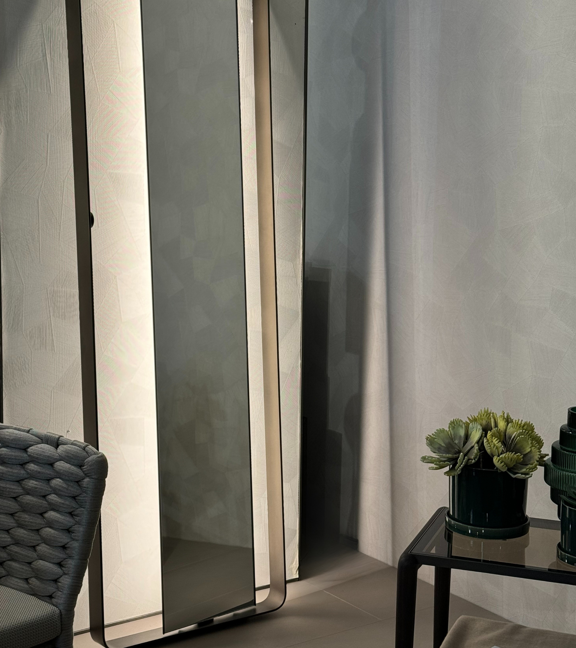 Bamboo è una collezione di specchi da appoggio a terra che combina due funzioni in un unico oggetto: da un lato specchio, dall’altro fonte di luce soft e d’atmosfera. Lo specchio è retroilluminato a LED, è incernierato a un frame in metallo.
