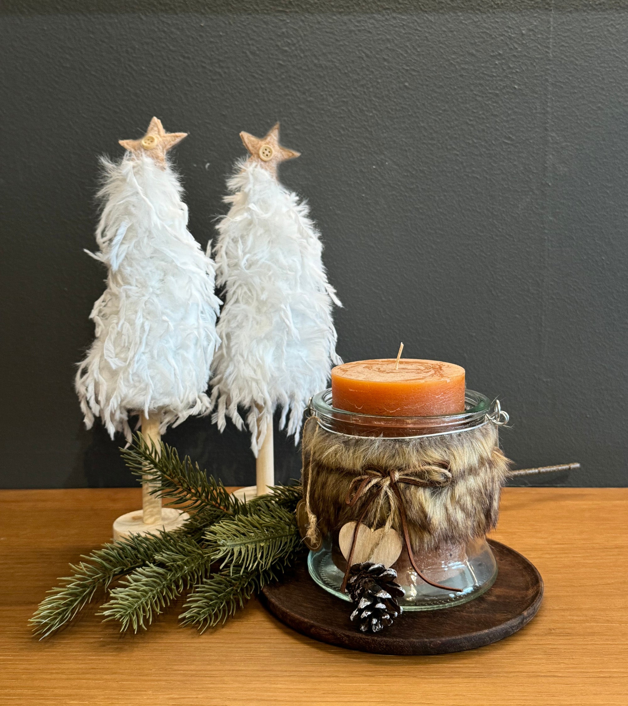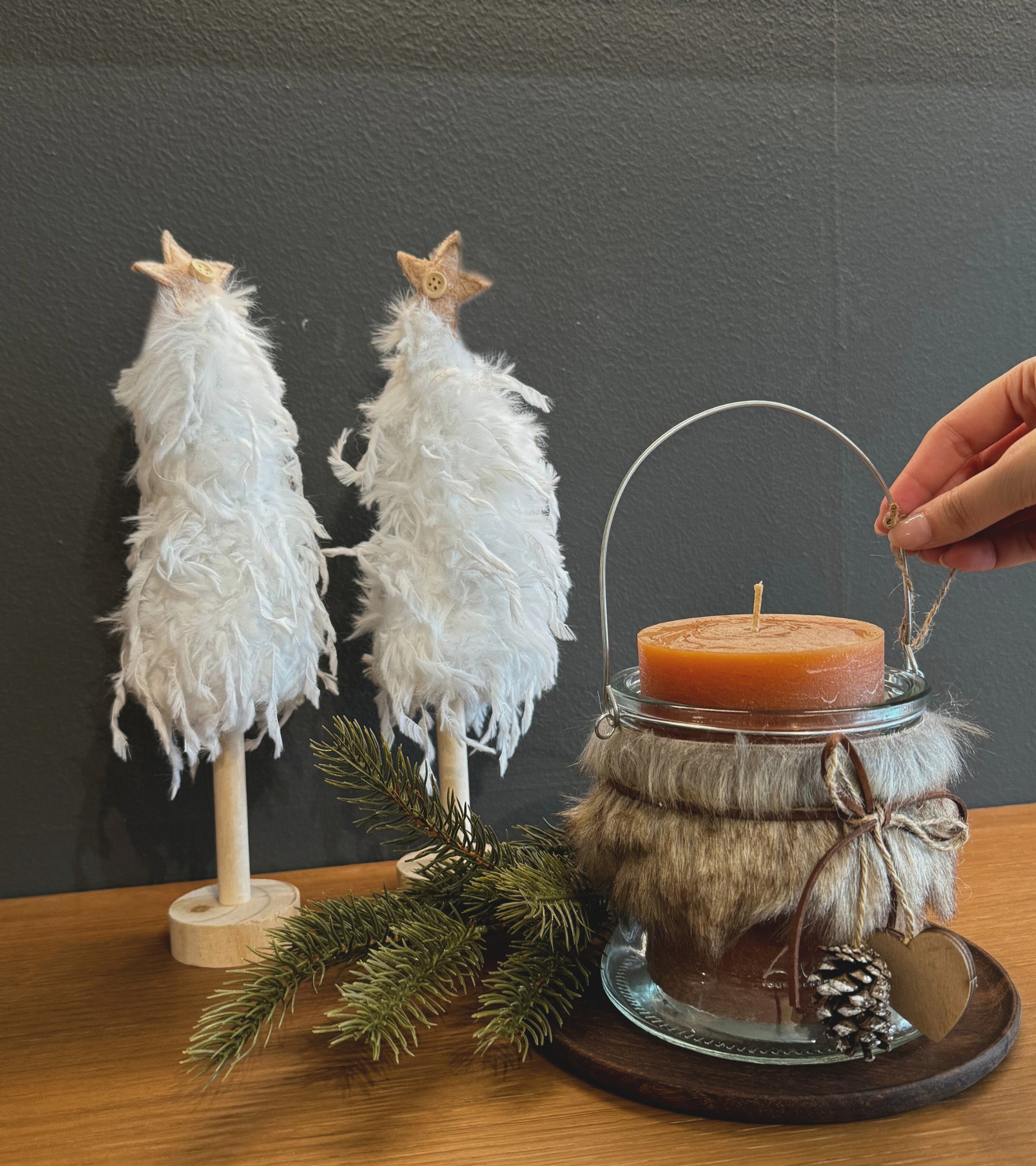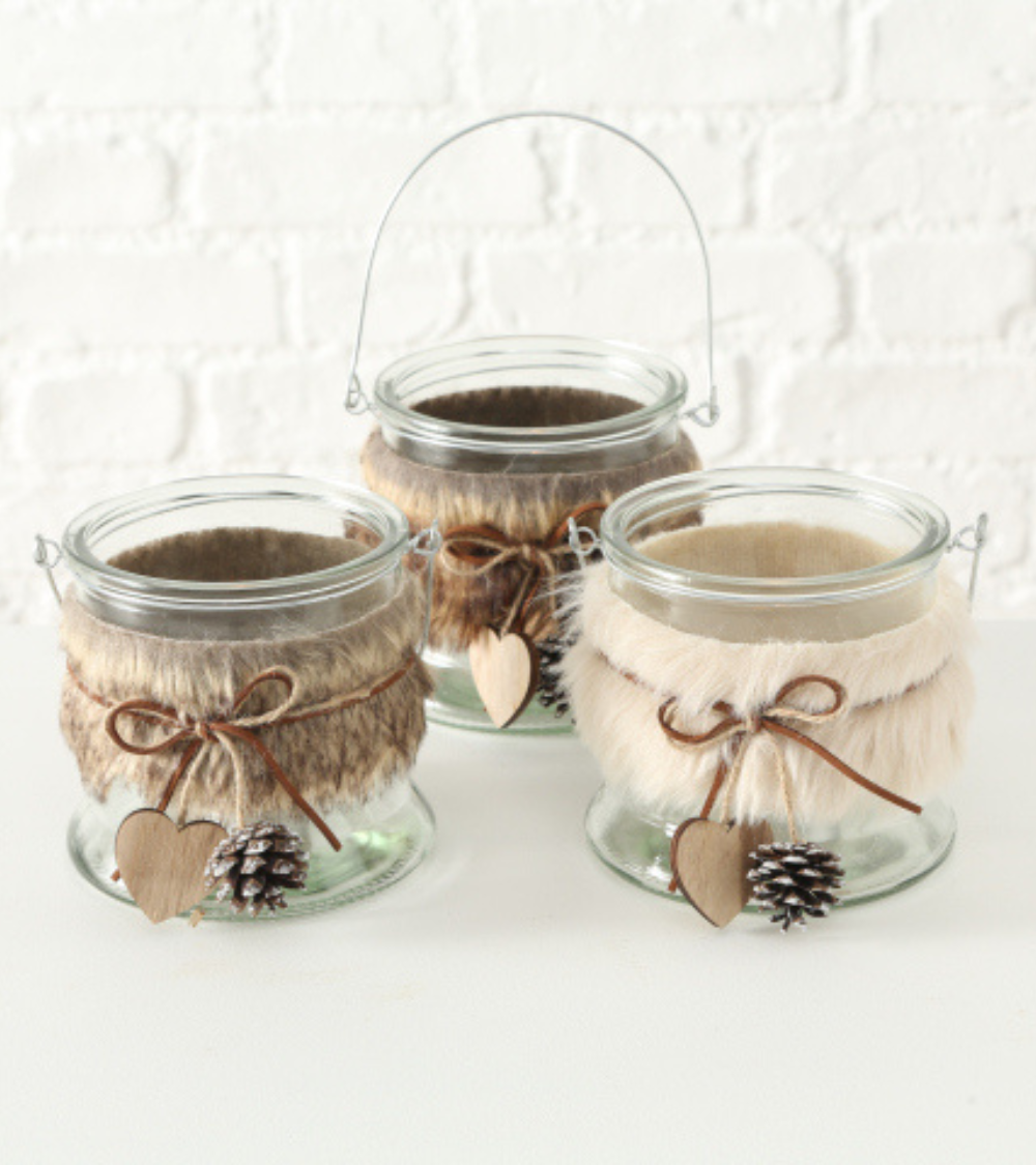 Lanternine in vetro con manico. Fascia in pelliccia con cuoricino in legno naturale e pigna.