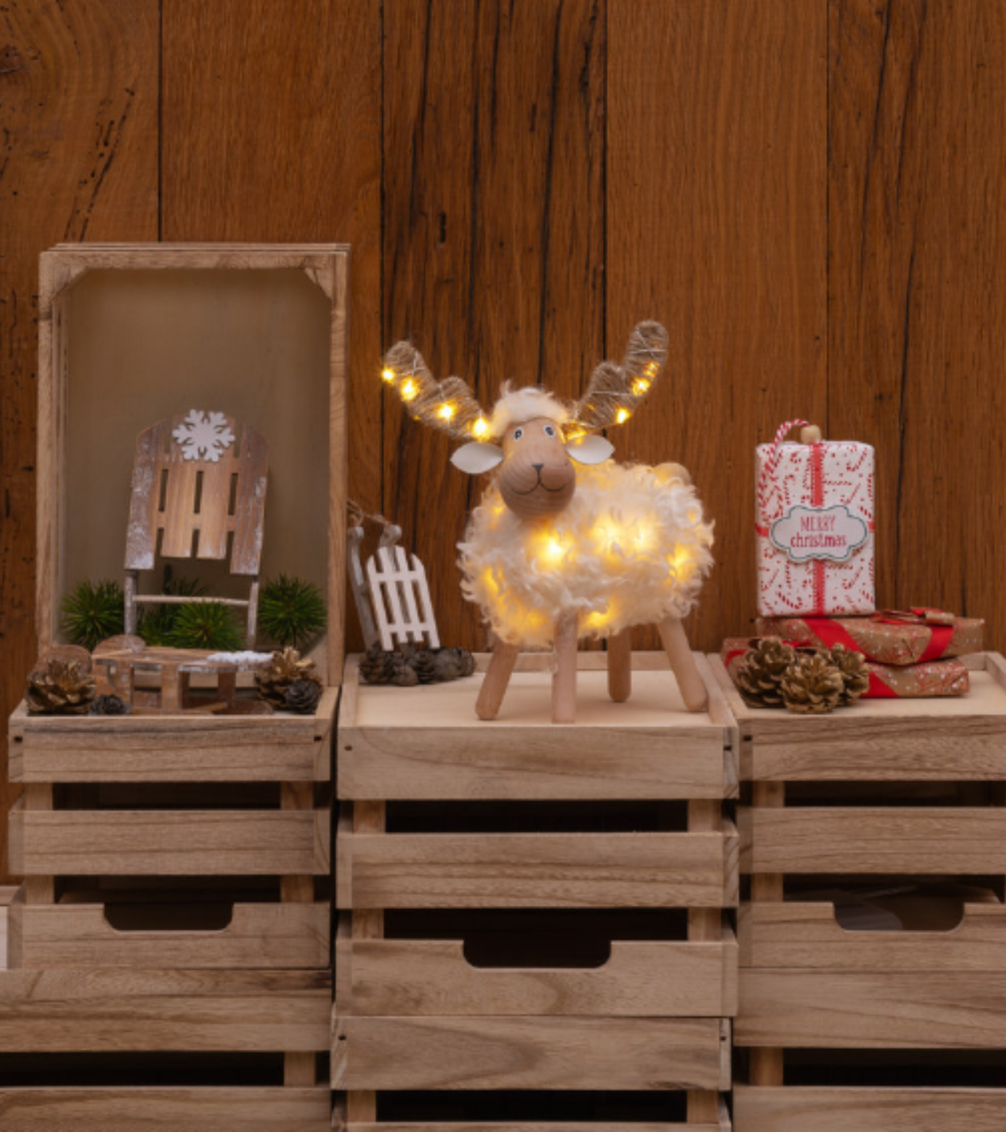 Dolce, simpatica e irresistibilmente natalizia! Questa pecorenna decorativa unisce il calore del legno al soffice manto bianco illuminato da delicate luci LED. Perfetta per creare un’atmosfera magica e gioiosa in casa, è l’elemento ideale per arricchire le tue decorazioni natalizie con un tocco tenero e originale.