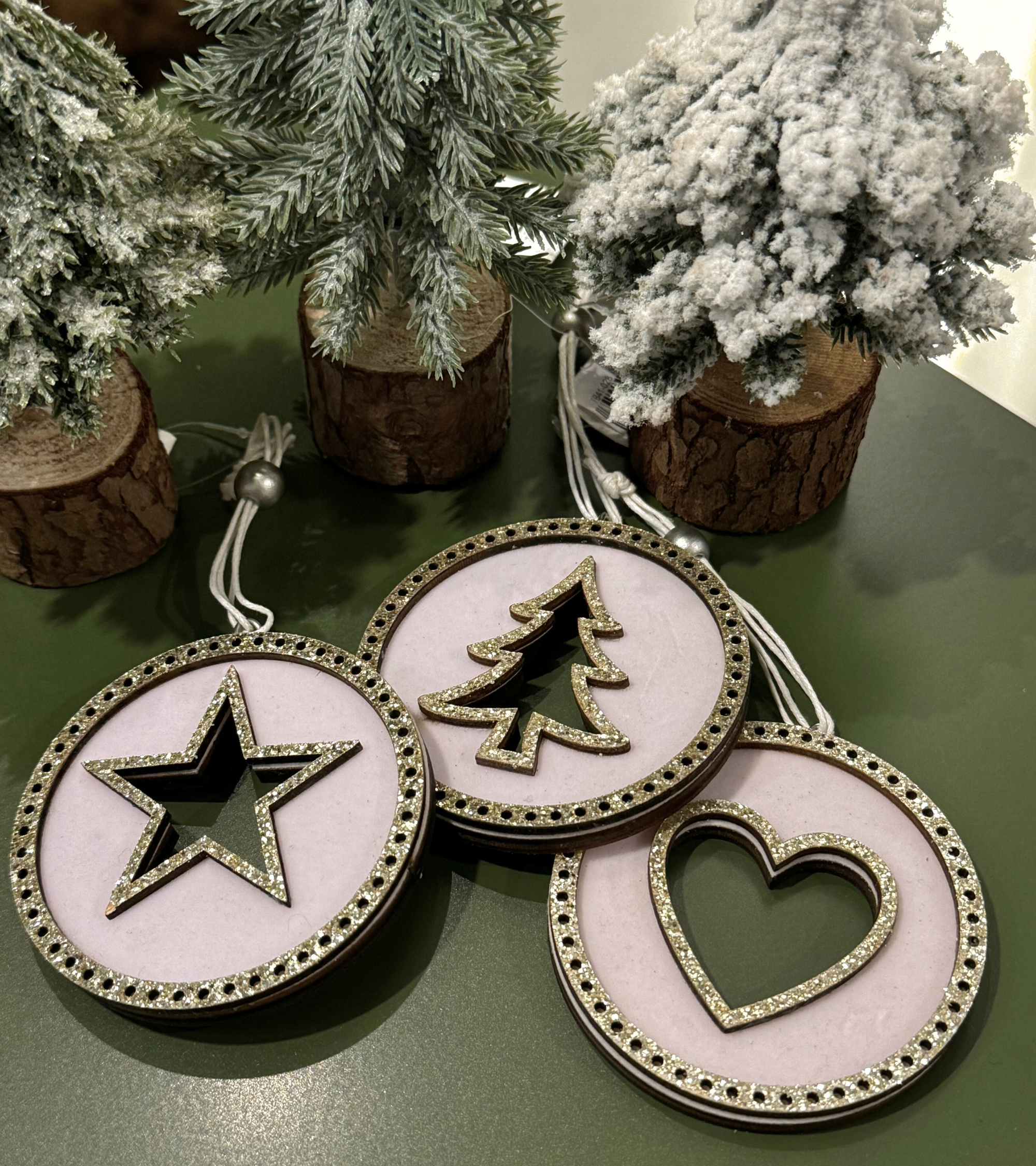 Una decorazione natalizia che raffigura un cerchio con all'interno figure diverse come stella, albero e cuore. Ideale per decorare l'albero o la propria casa dando un tocco festivo, elegante e moderno.