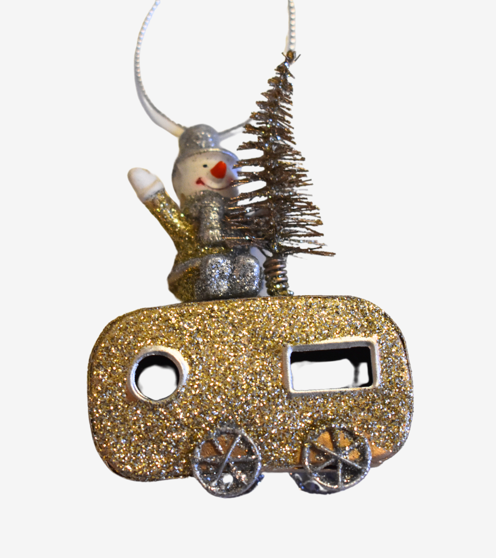 Appendino a in metallo ricoperto di glitter oro con simpatico pupazzo di neve e alberello