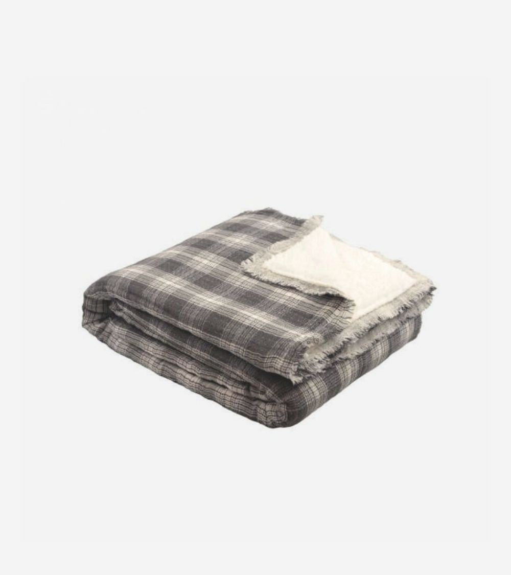 Plaid in 100% cotone garzato con disegno a quadri, colore tortora/bianco latte, doppiato con pelliccia sintetica 100% poliestere colore bianco latte.