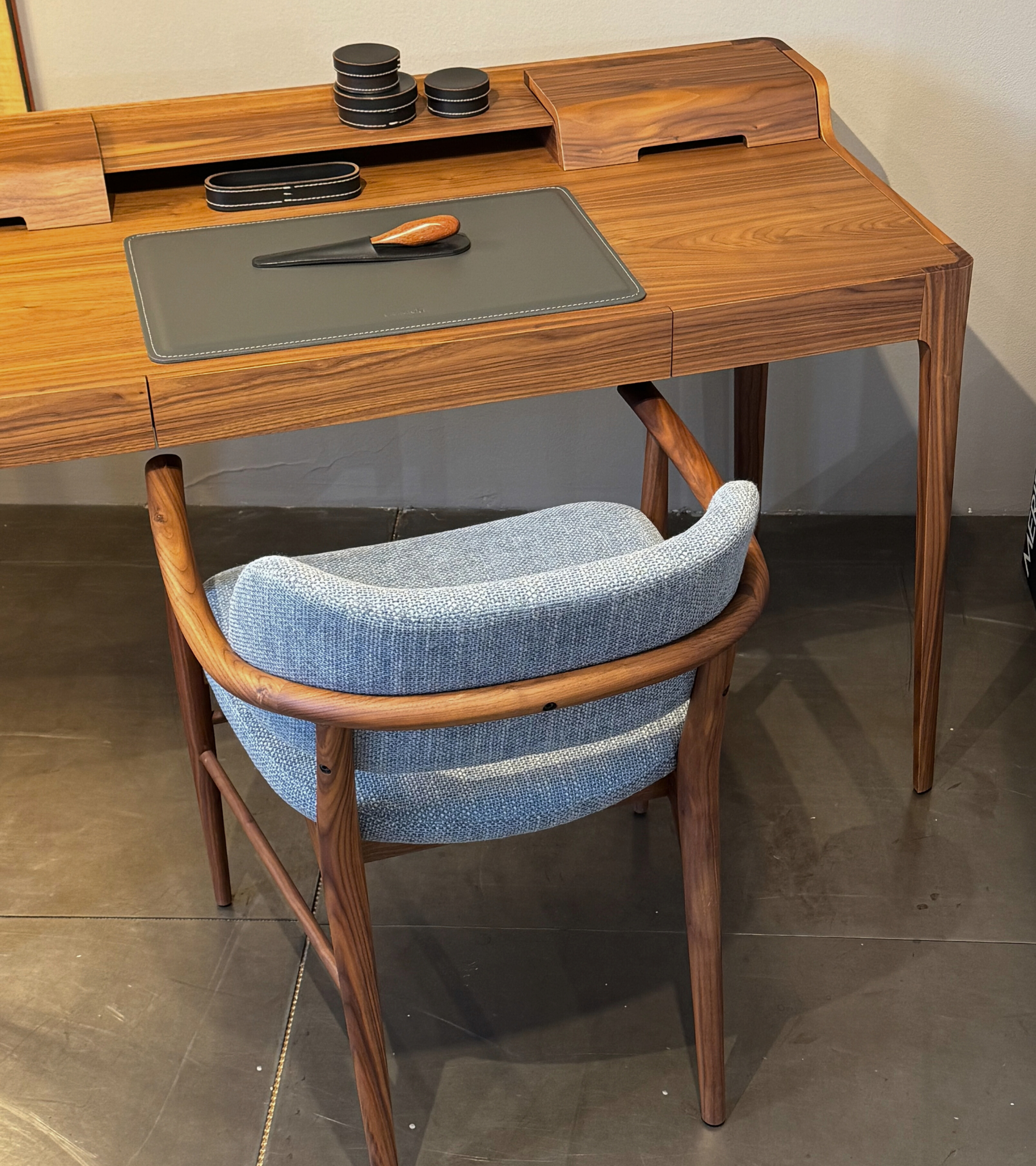 Sedia NISSA esposta con braccioli, in massello di legno noce canaletta e imbottitura tessuto Madras 12 cat. C