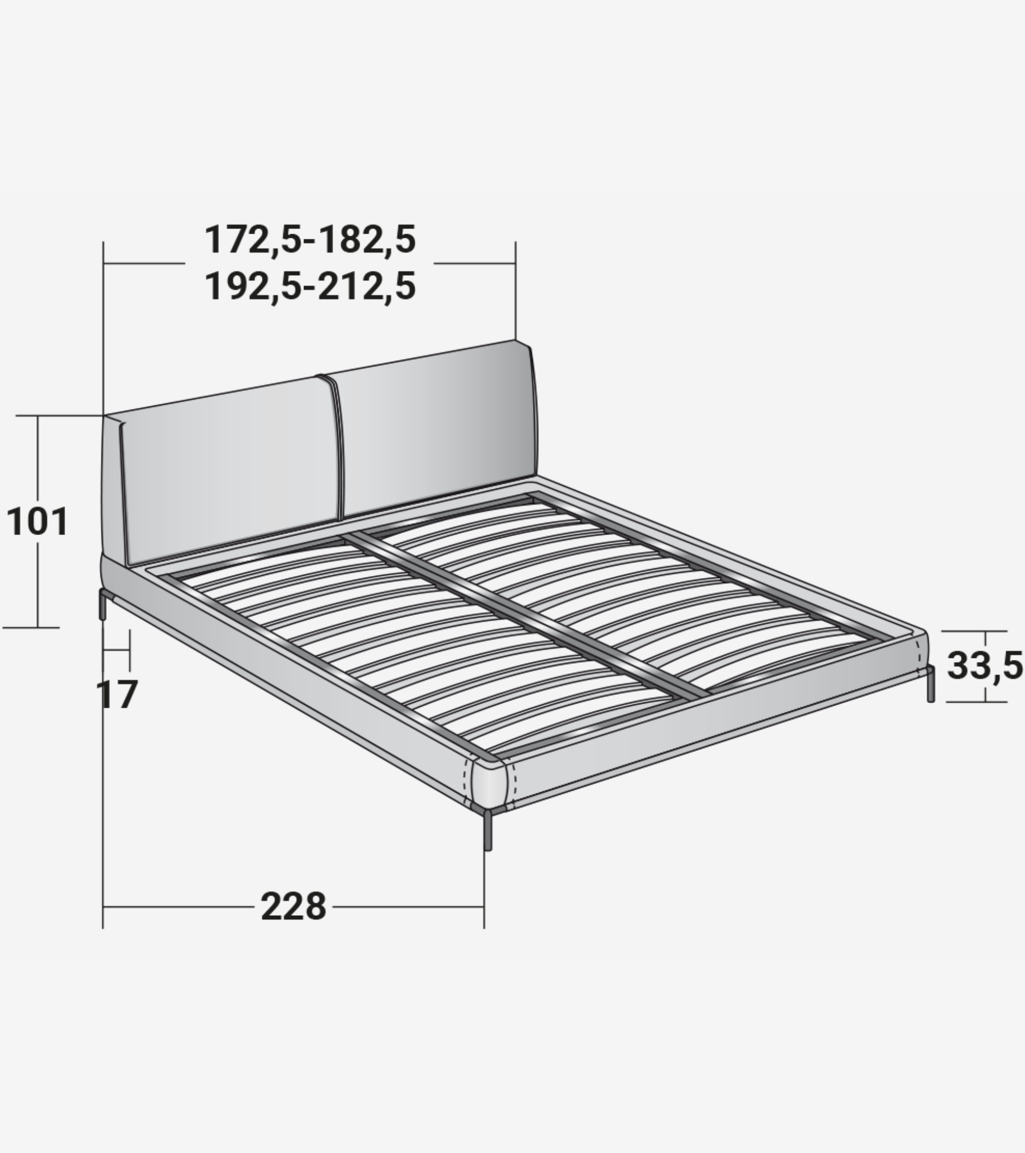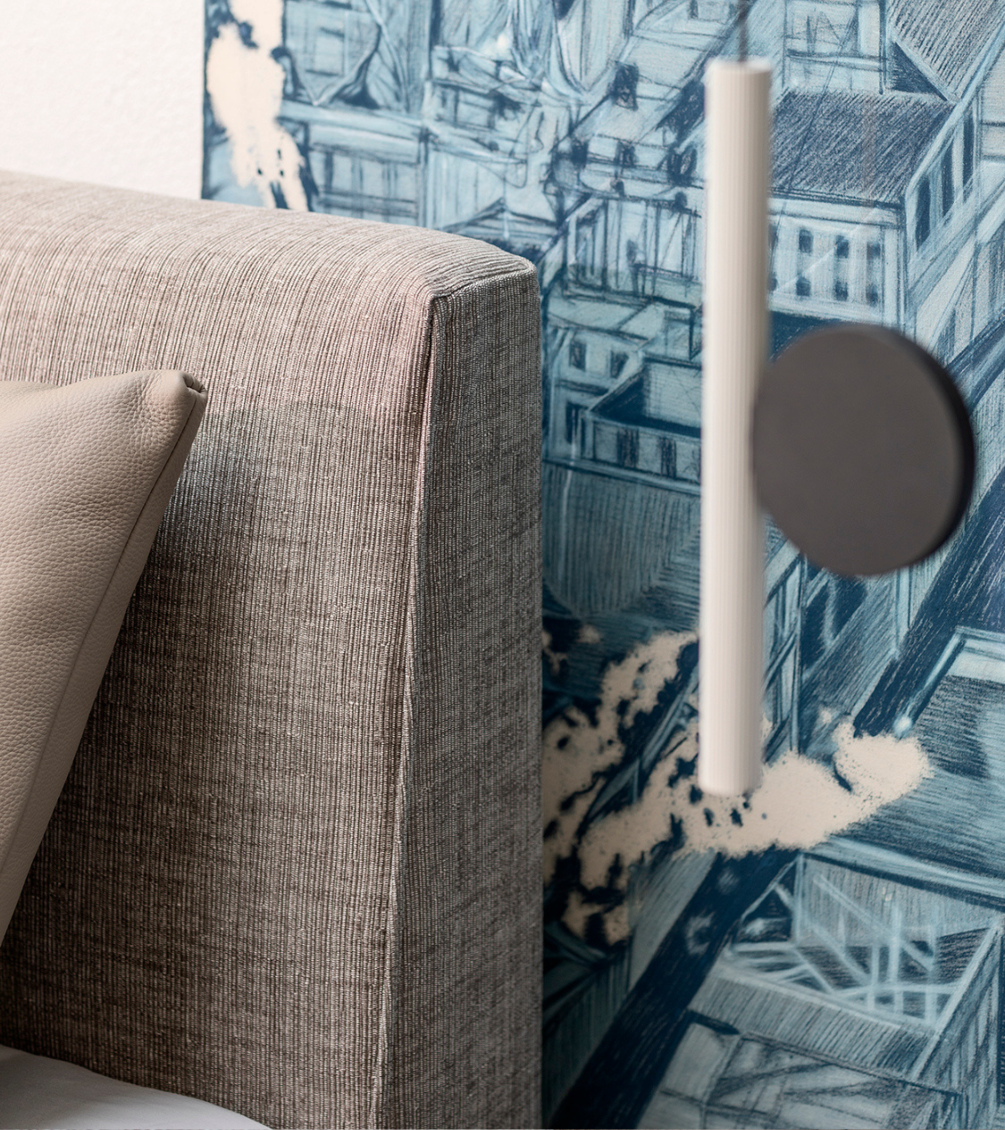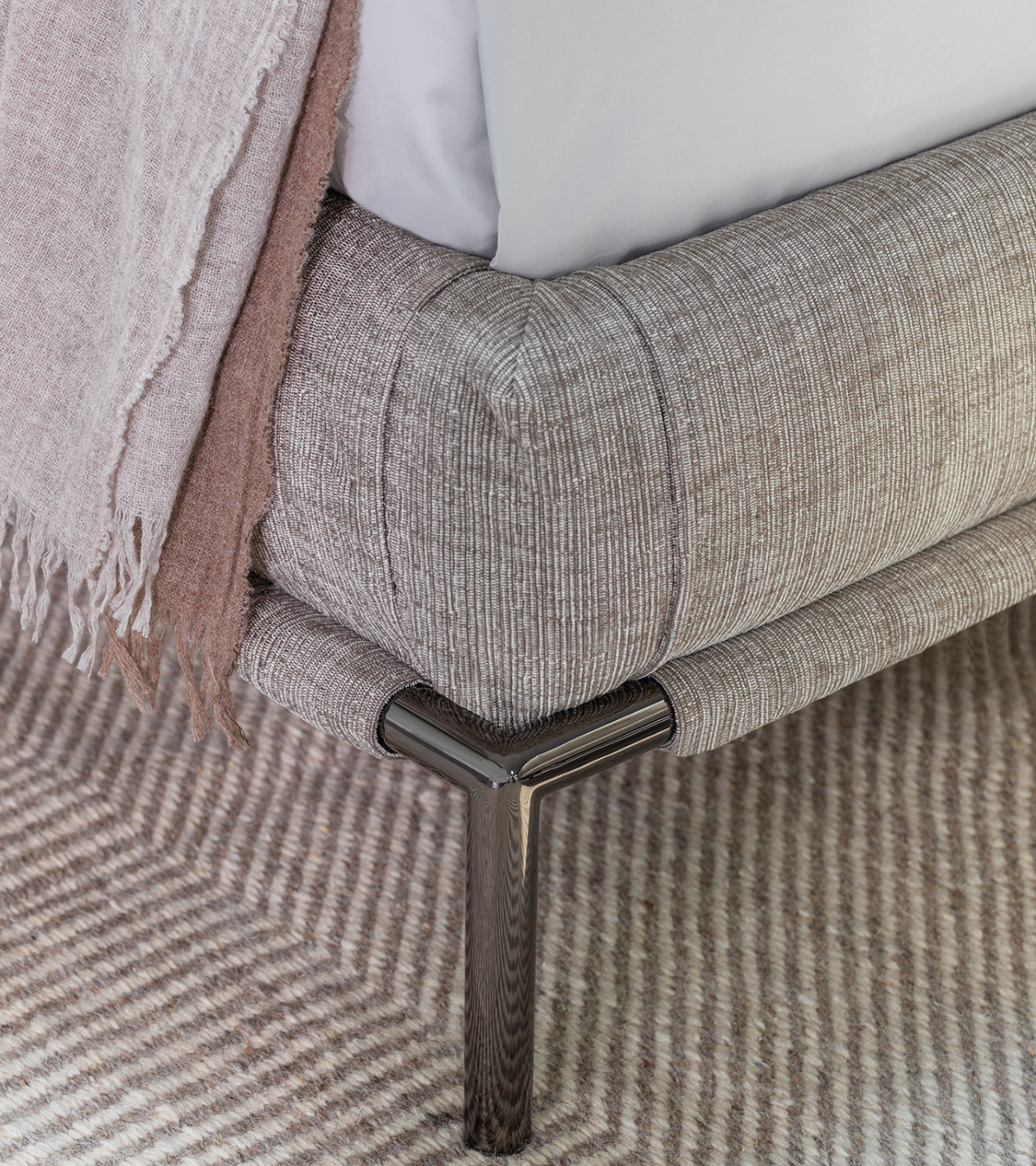 La testata morbidamente imbottita, rivestita come il basamento in tessuto o pelle sfoderabili, forma un piacevole contrasto con i raffinati dettagli in metallo percepibili in corrispondenza dei piedini di appoggio.