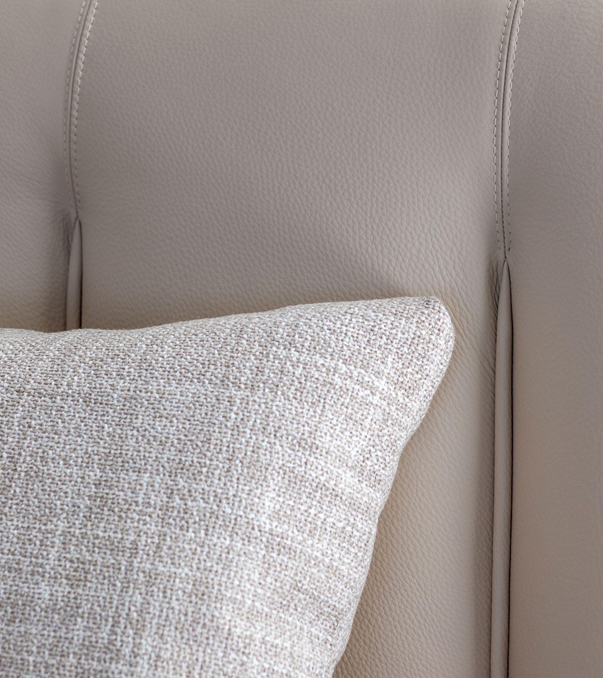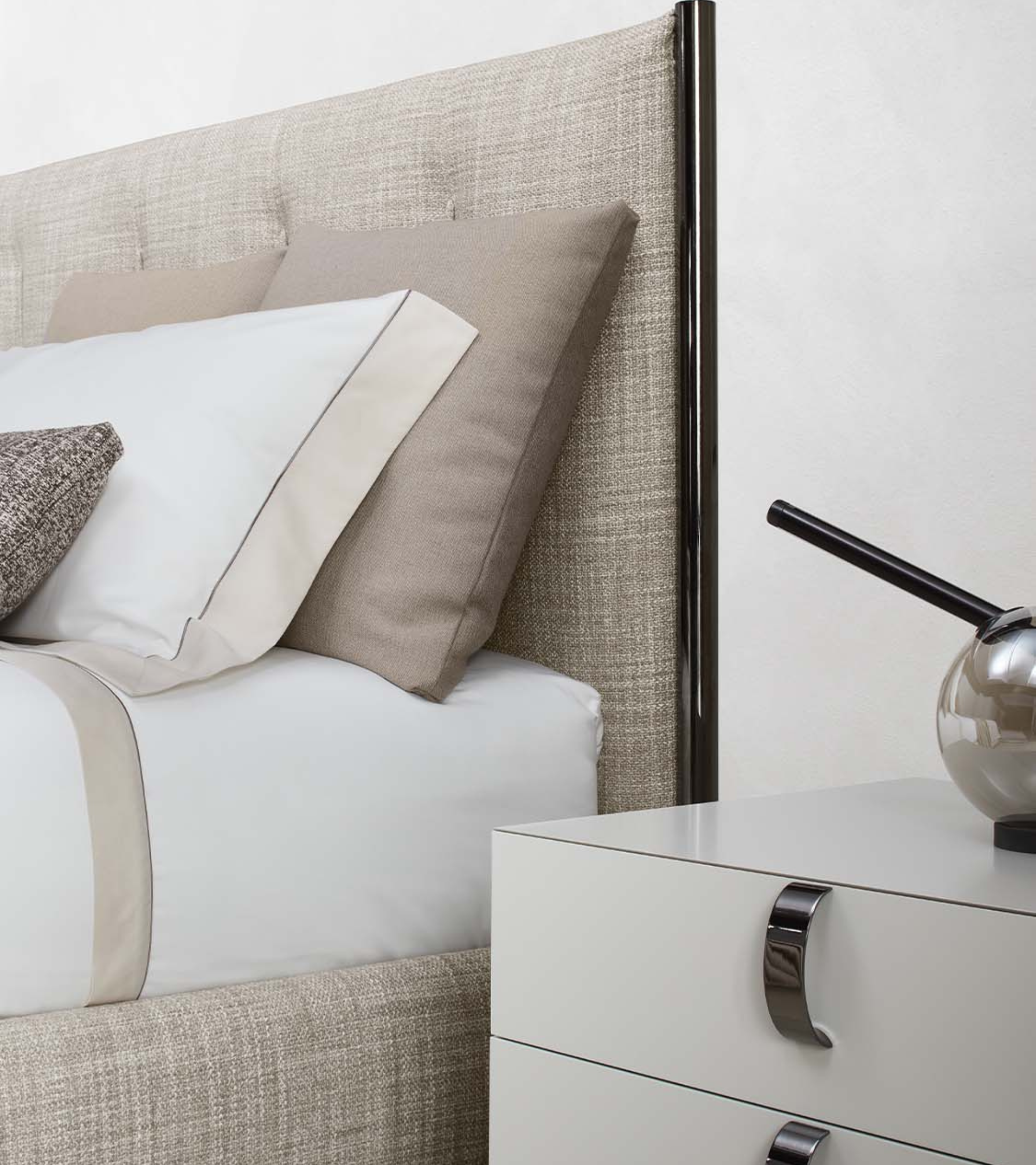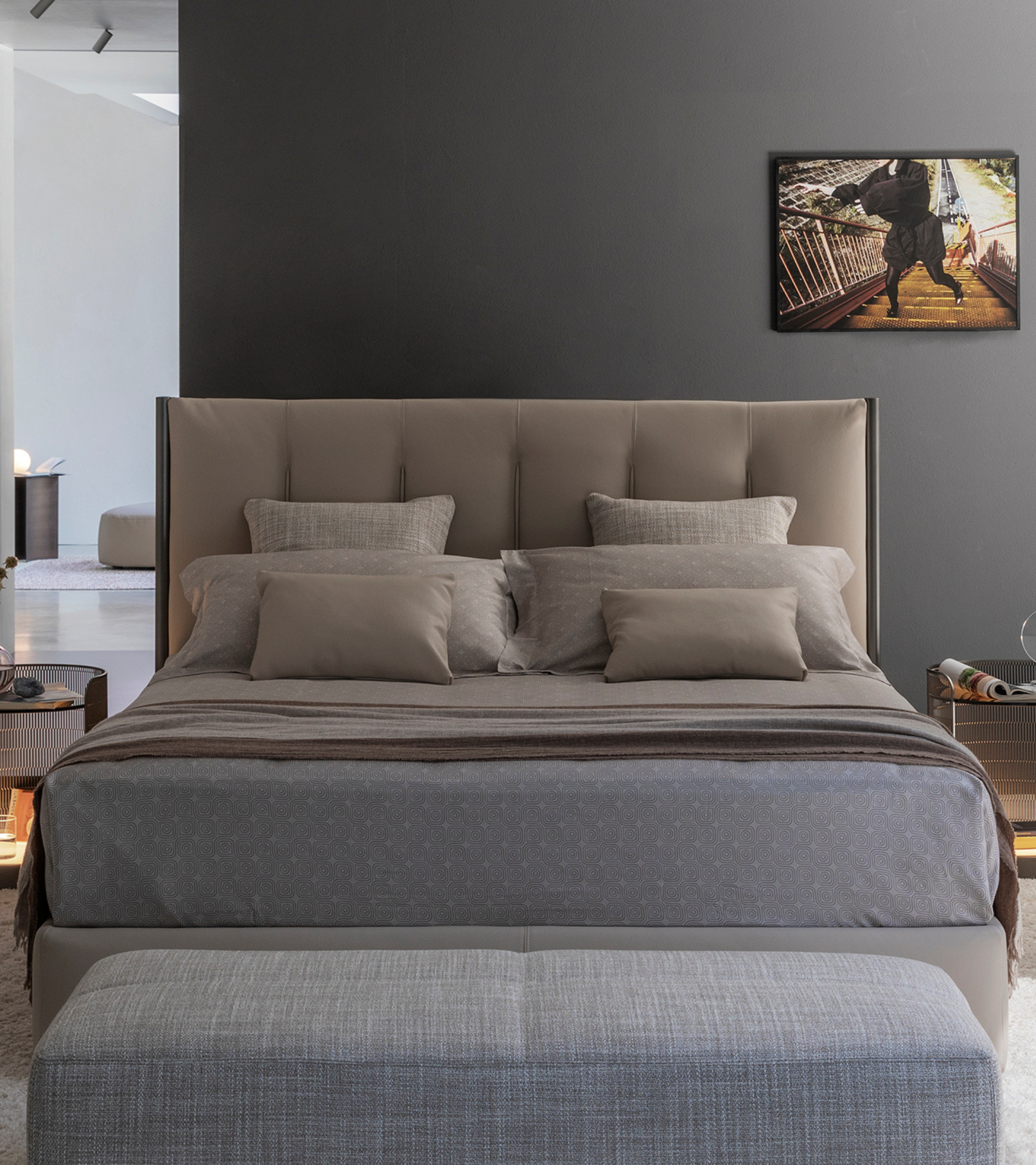 La forma rigorosa della testata, incorniciata dalla preziosa struttura in metallo che scende a formare i piedini, è addolcita dal tessuto sapientemente lavorato a trapuntature verticali, che la slanciano e donano al letto un disegno accogliente e sofisticato.