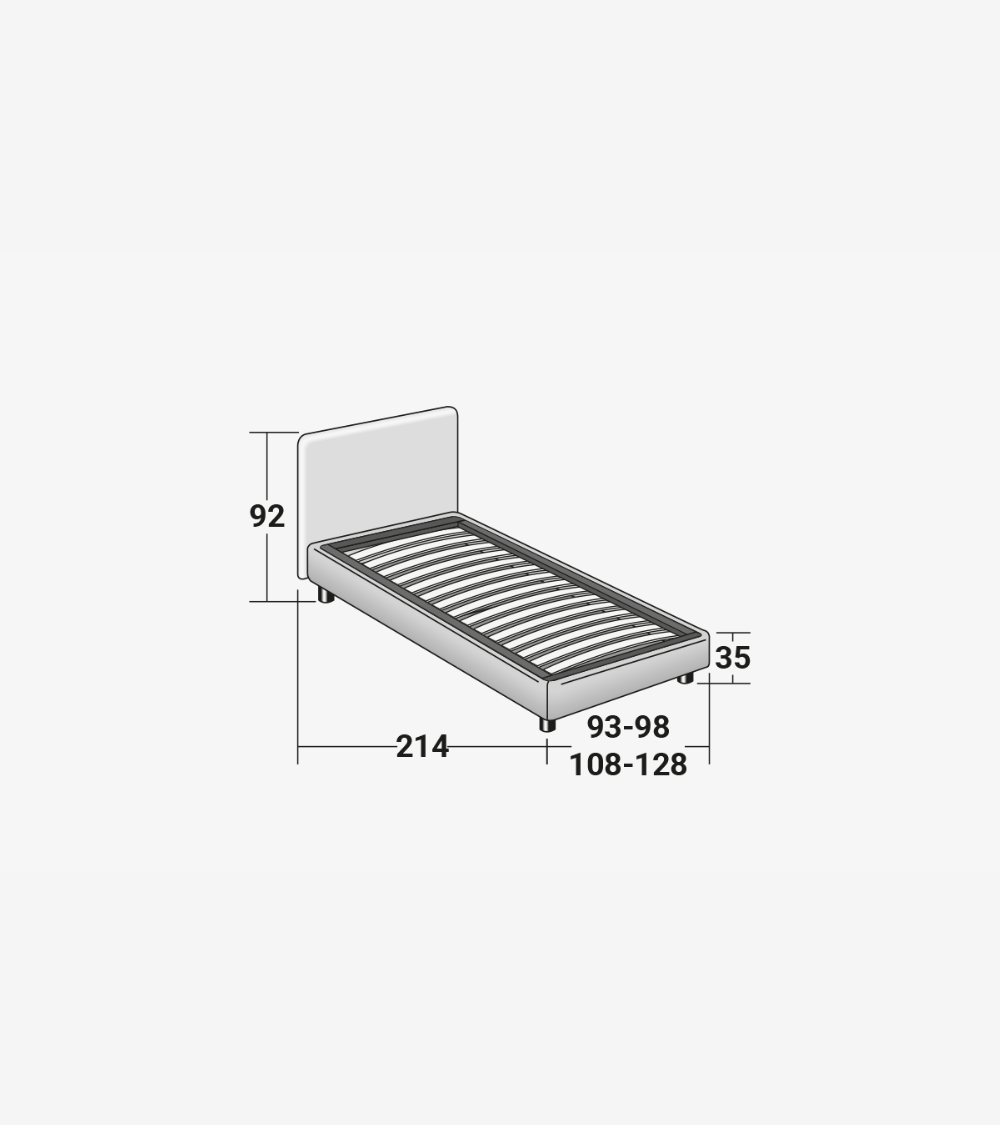 La testata con inserto in acciaio è diritta e liscia, imbottita e rivestita, come la base, in tessuto o pelle completamente sfoderabile grazie al velcro.