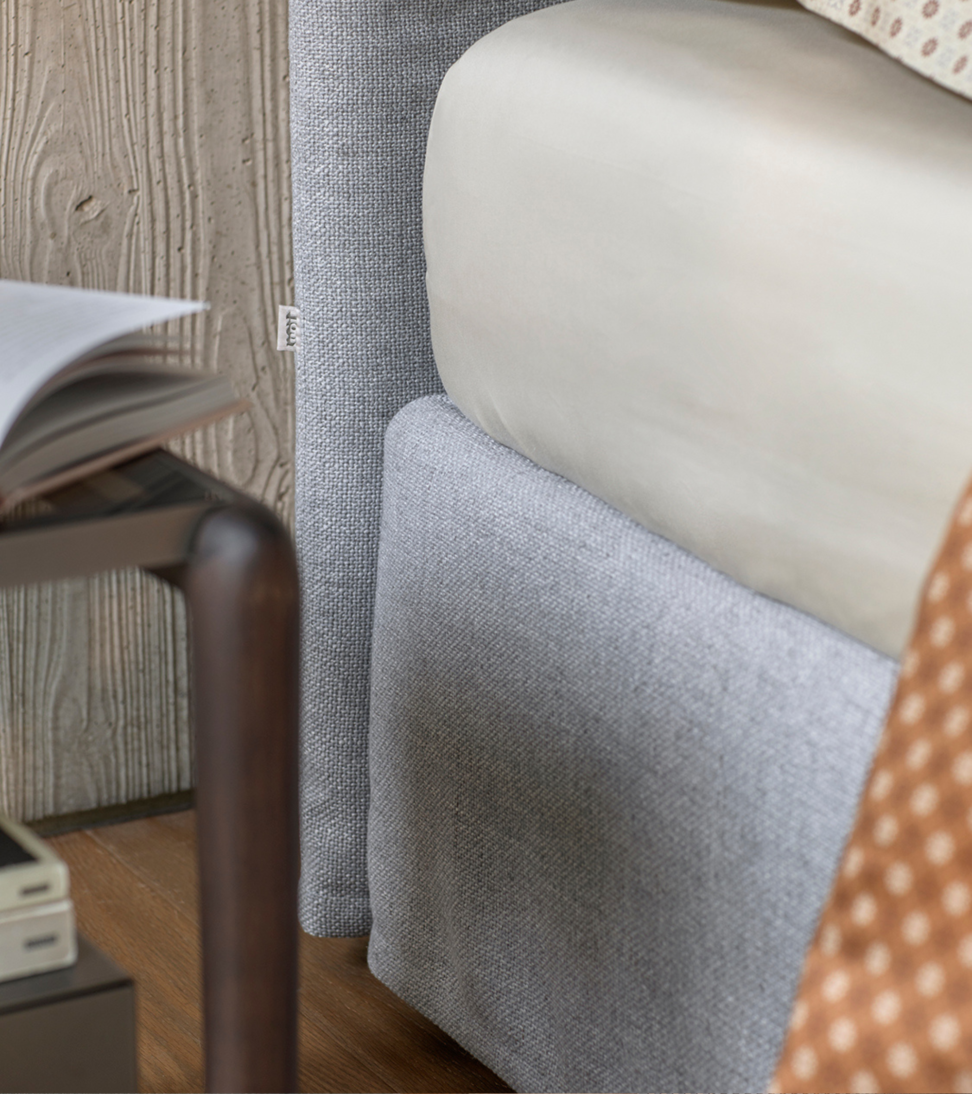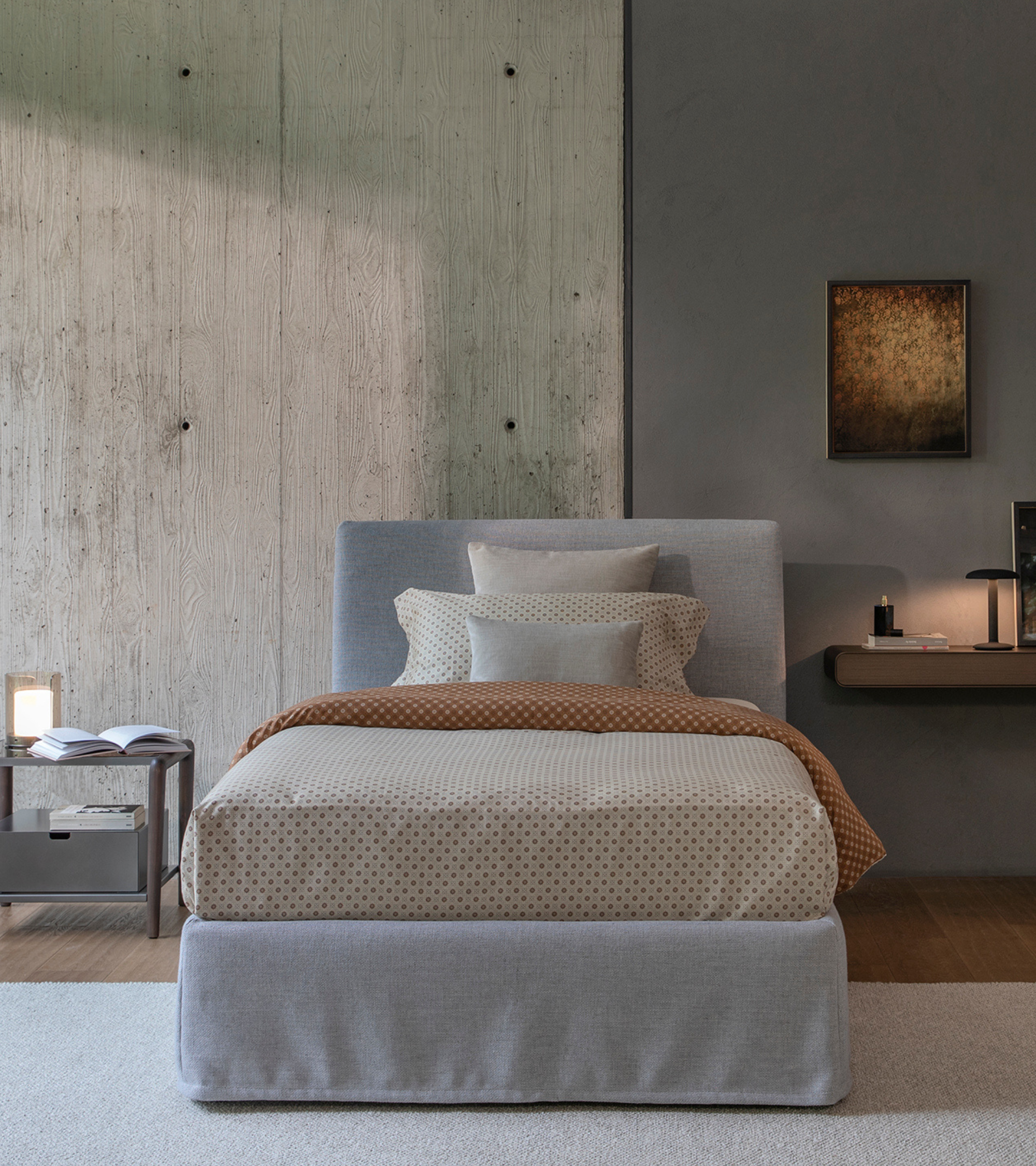 La testata diritta e liscia, è imbottita e rivestita, come la base, in tessuto o pelle completamente sfoderabili.