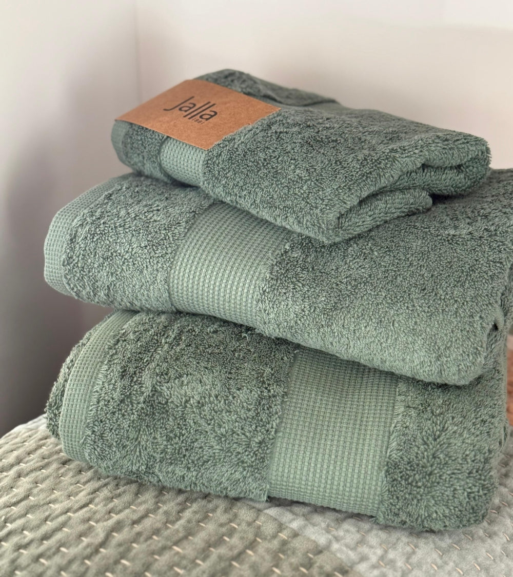 Coppia di asciugamani in spugna Jalla in puro cotone (di cui almeno il 50% proviene da agricoltura biologica), composta da due pezzi di dimensioni diverse dello stesso colore: