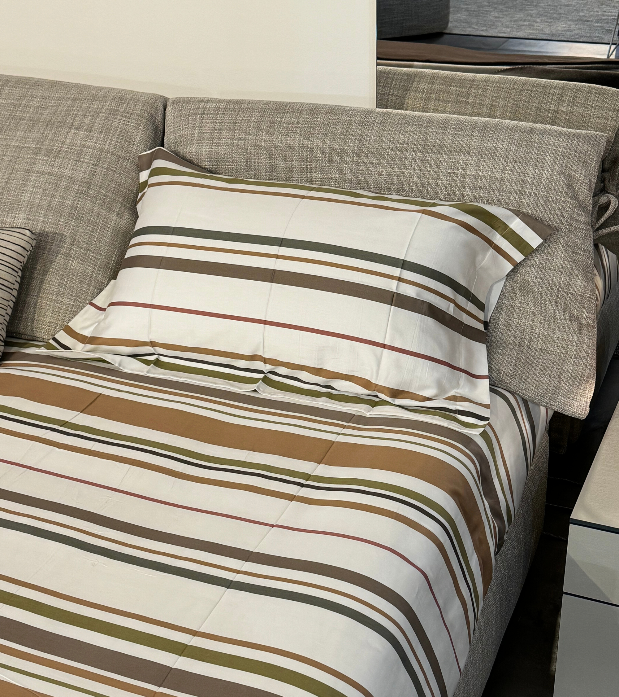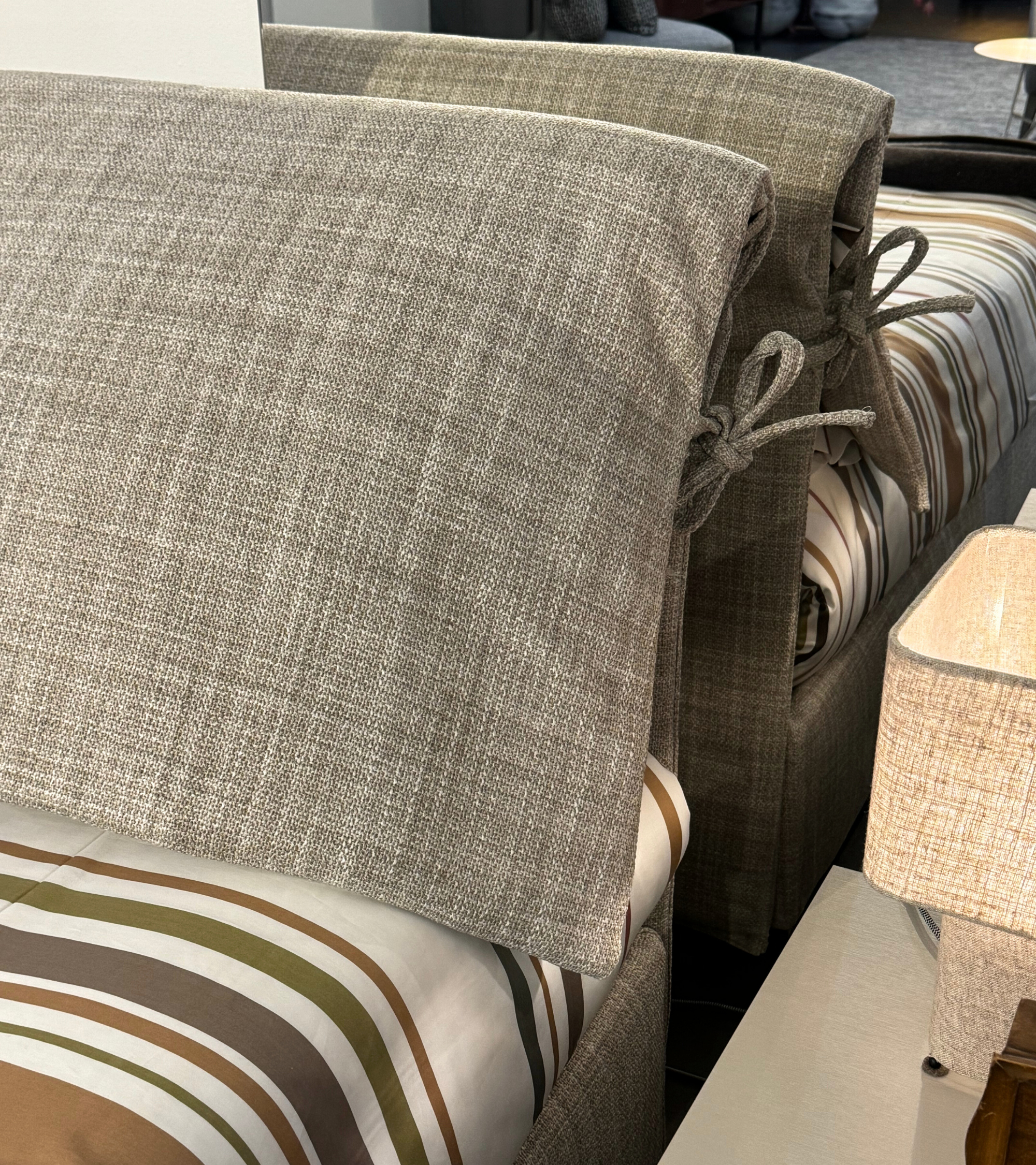 Inconfondibile con i suoi caratteristici fiocchetti, Nathalie è il capostipite dei letti tessili. Testata e base sono rivestite in tessuto Alexander 813 categoria 4, completamente sfoderabili grazie alle pratiche chiusure in velcro. I copricuscini presenti sulla testata permettono di riporre i guanciali al riparo dalla polvere.